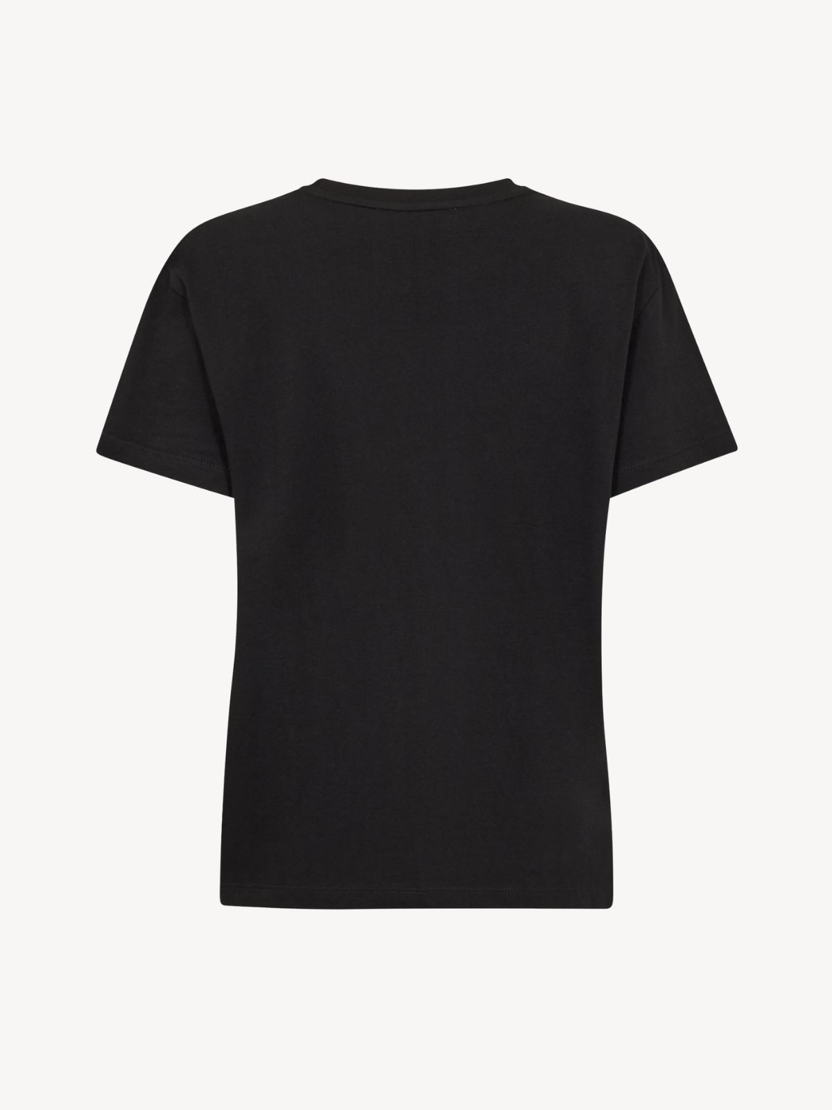 Tidløs T-shirt med klassisk O-hals og korte ærmer for en komfortabel pasform. Det markante frontprint giver et moderne twist og gør den til et statement-piece i garderoben. Brug den med jeans til hverdagsbrug eller under en blazer for et cool og stilfuldt look.