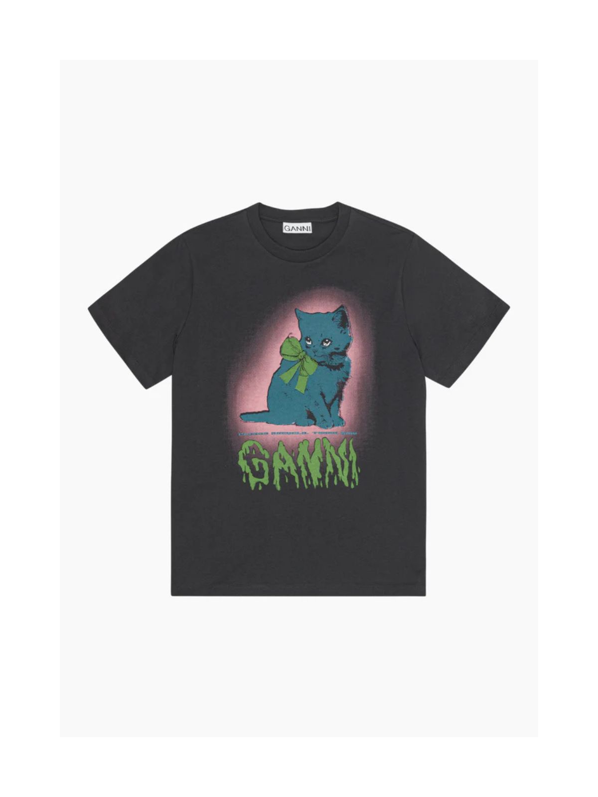 T-shirt med rund hals, korte ærmer og GANNI-logo. Fremstillet i 100% økologisk bomuld med grafisk katteprint og teksten 'Have a nice day! Please recycle!'.