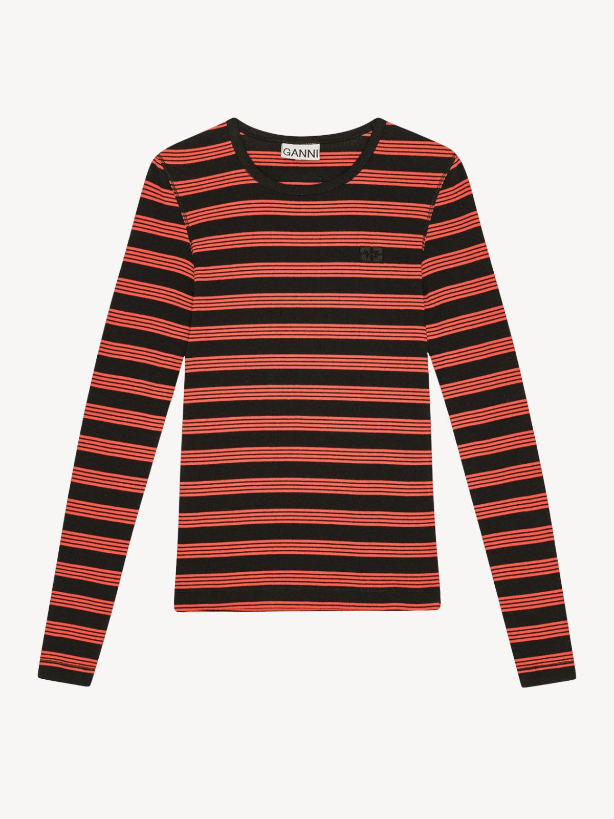 Blød T-shirt i ribstrik med rund hals og lange ærmer. Den har et stribet mønster og et diskret tone-i-tone logo på brystet.