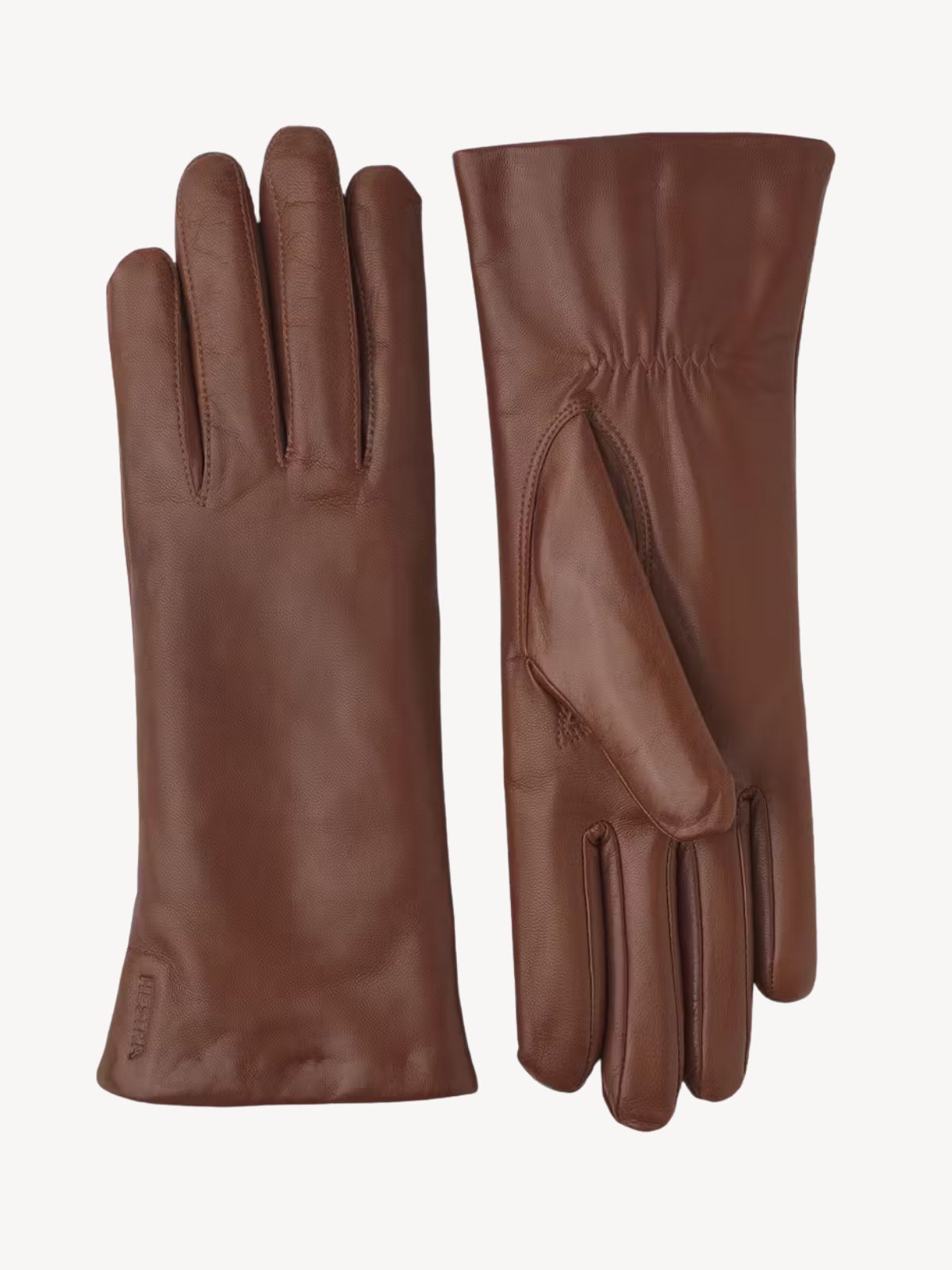 Stilfuld minimalistisk skindhandske fra HESTRA designet med et blødt, strikket uldfor. Handsken er syet i smidig italiensk lammenappa med en tætsiddende pasform. Et klassisk modetilbehør, der vil løfte dit outfit til hverdagsbrug og ved særlige lejligheder.