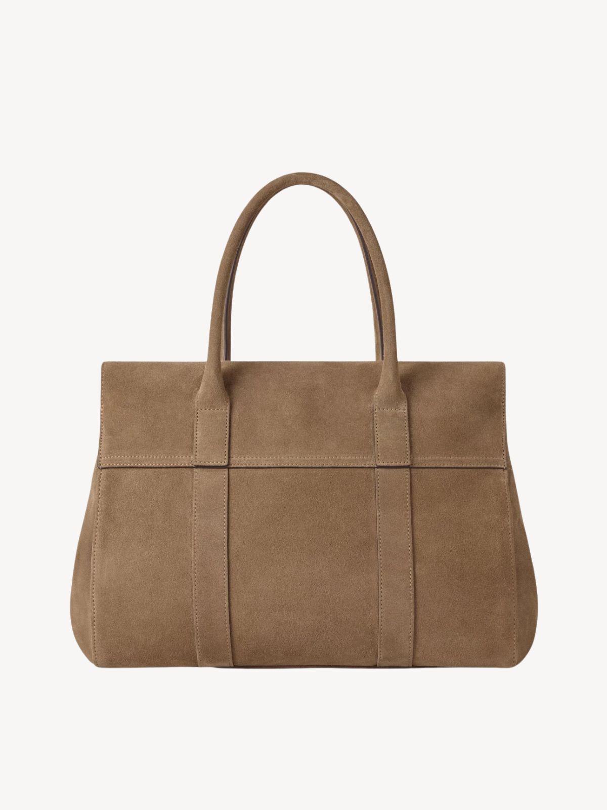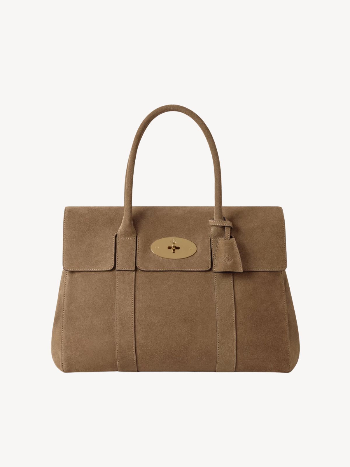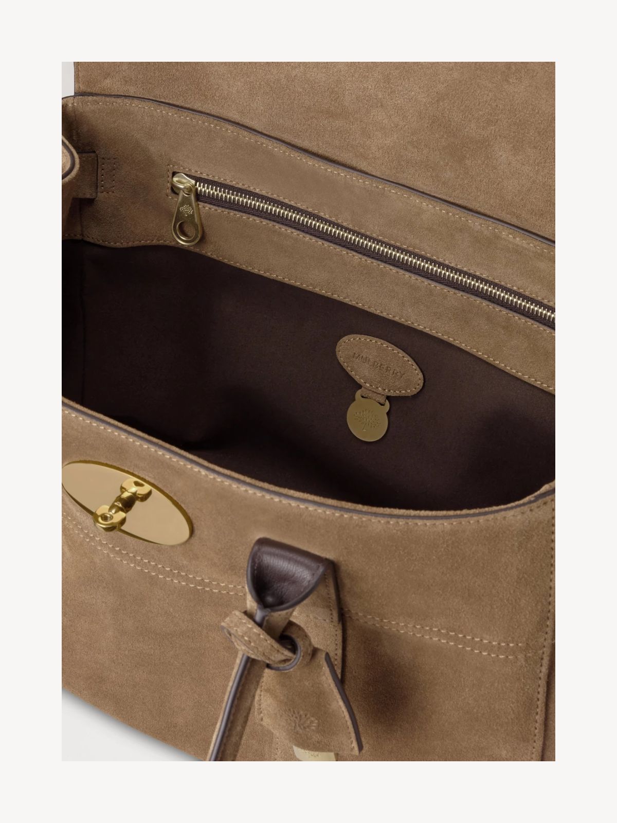 Den klassiske Bayswater Shoulder Bag fra Mulberry er en tidløs skuldertaske, der fremhæver det ikoniske Postman's Lock-design. Tasken er fremstillet i koskindssuede med klar resinbagbeklædning, hvilket giver en glat og kontrastfuld overflade samt nemmere vedligeholdelse.