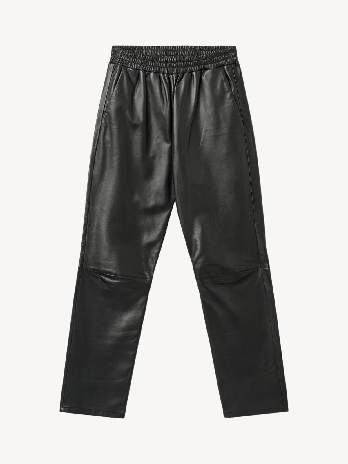 Nea Pants er luksuriøse bukser i blødt, smidigt lammeskind, der giver en eksklusiv fornemmelse og en komfortabel pasform. Den elastiske talje gør dem fleksible og behagelige at have på, mens bæltestropper og to lommer foran tilføjer et praktisk og moderne udtryk. Et tidløst design, der kan styles både afslappet og elegant – perfekt til alt fra hverdagsbrug til aftenlook.