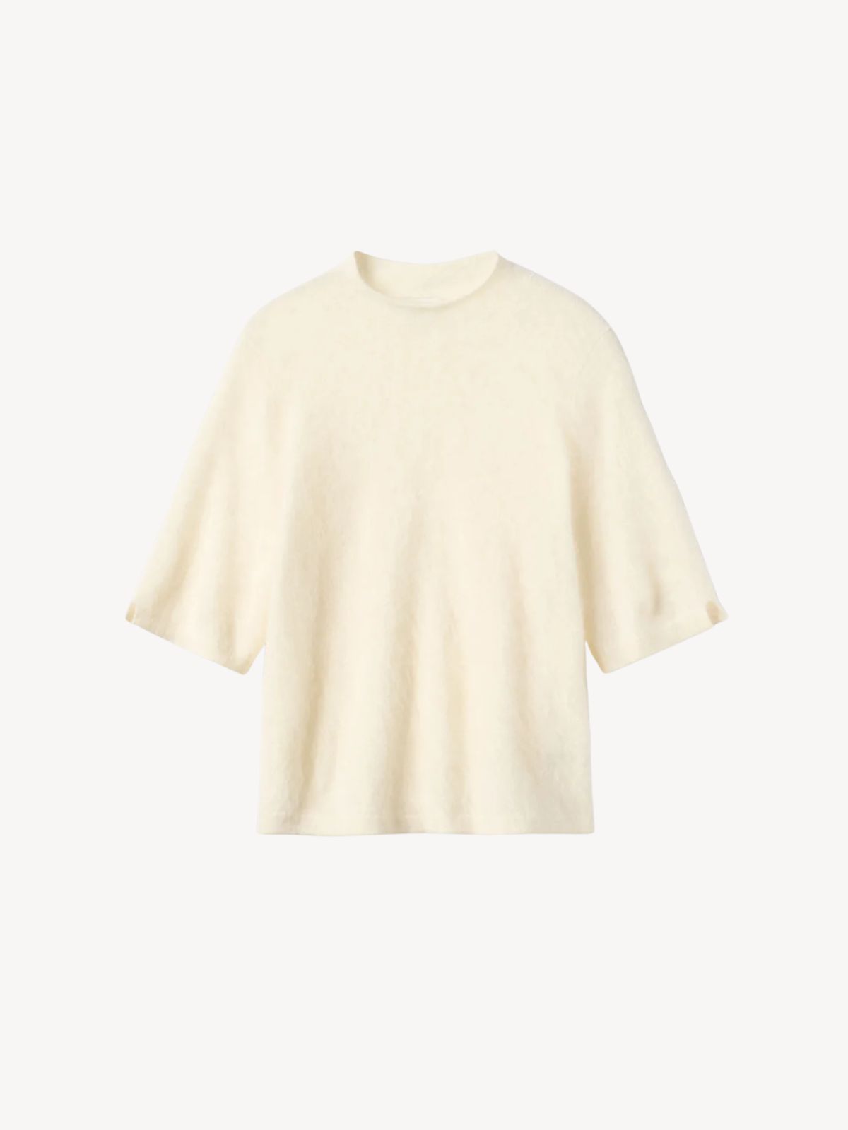 Denne T-shirt i 100% brushed cashmere har en exceptionel blødhed og en let, luksuriøs fornemmelse mod huden. Den er designet med høj hals og et enkelt, tidløst udtryk, som gør den nem at bruge både alene og som lag under strik, blazere eller skjorter. En elegant basisstyle, der løfter enhver garderobe med sin eksklusive kvalitet.