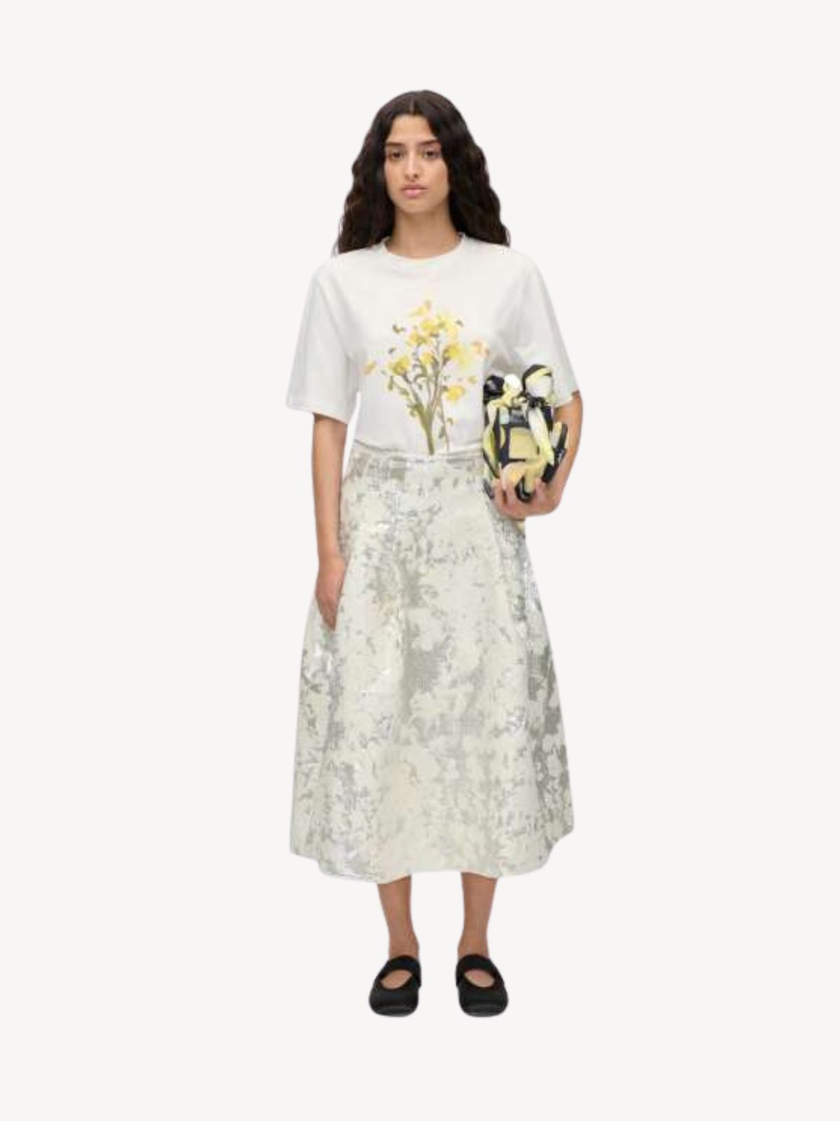Ankellang nederdel i off-white og sølv med metallisk jacquardvævning og abstrakt blomstermønster. Nederdelen har læg for ekstra volumen, fast linning og sidelommer.