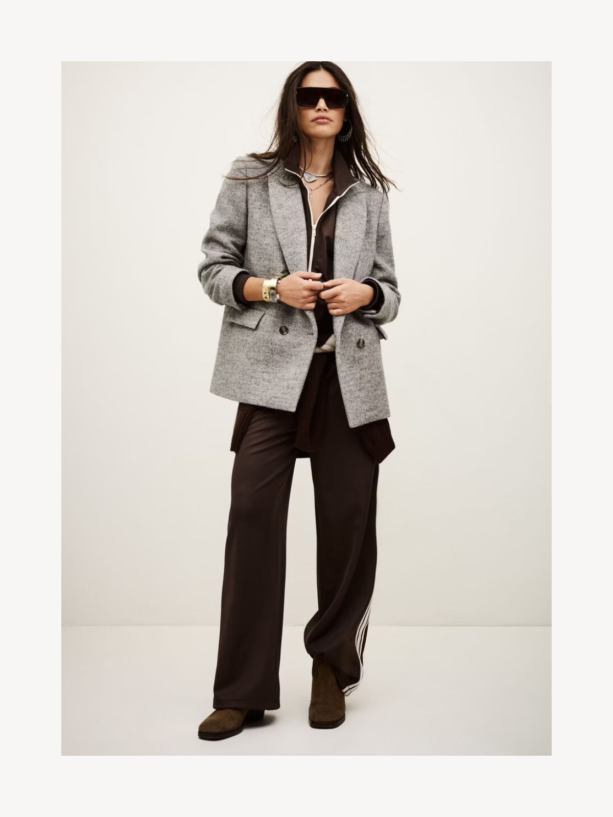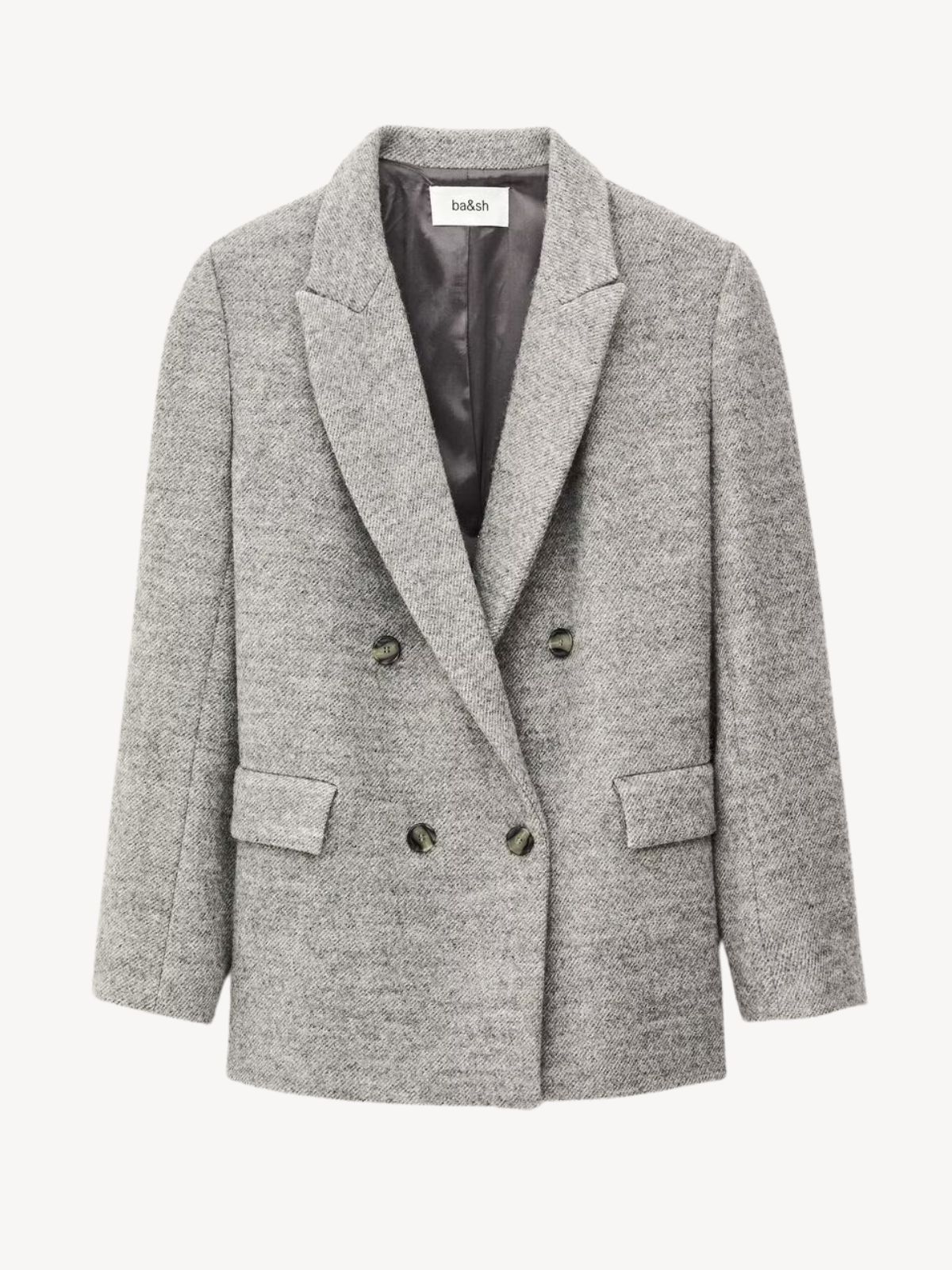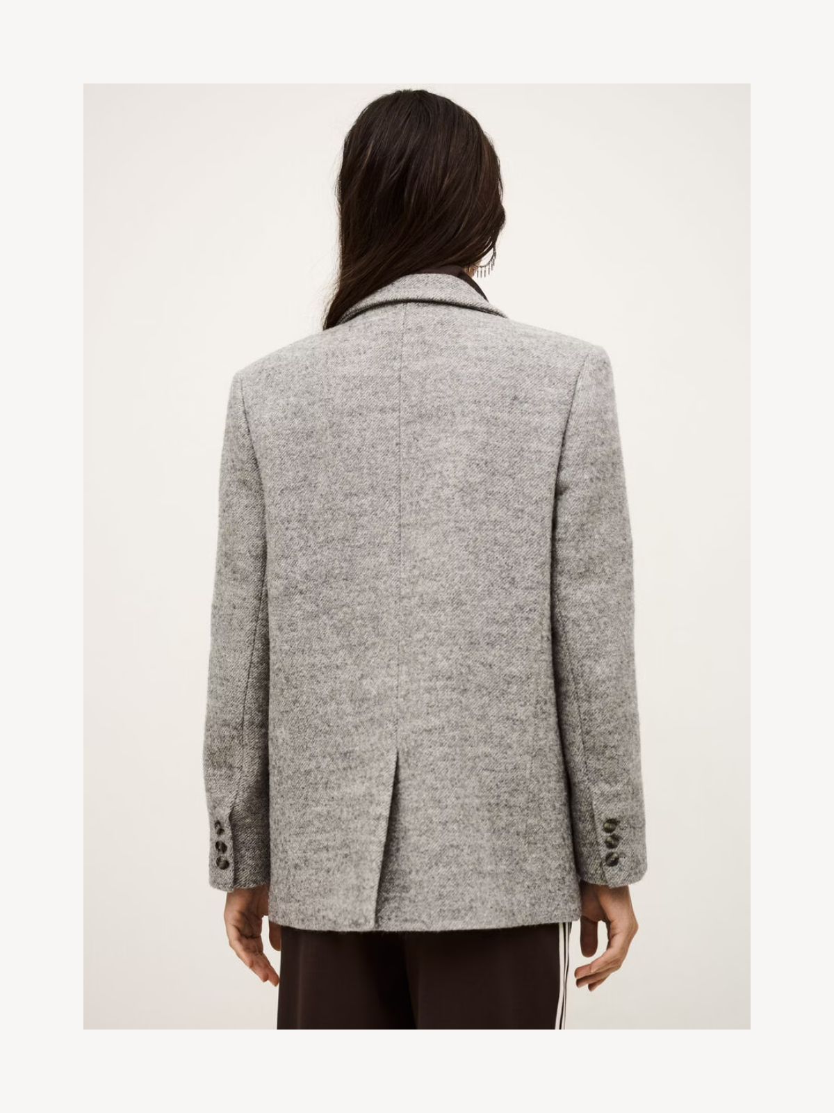 Elegant blazer i klassisk design med dobbeltradet lukning og sidelommer med klap. Fremstillet i blød upcycled uld, der kombinerer varme og holdbarhed, hvilket gør den perfekt til både hverdag og mere formelle lejligheder.