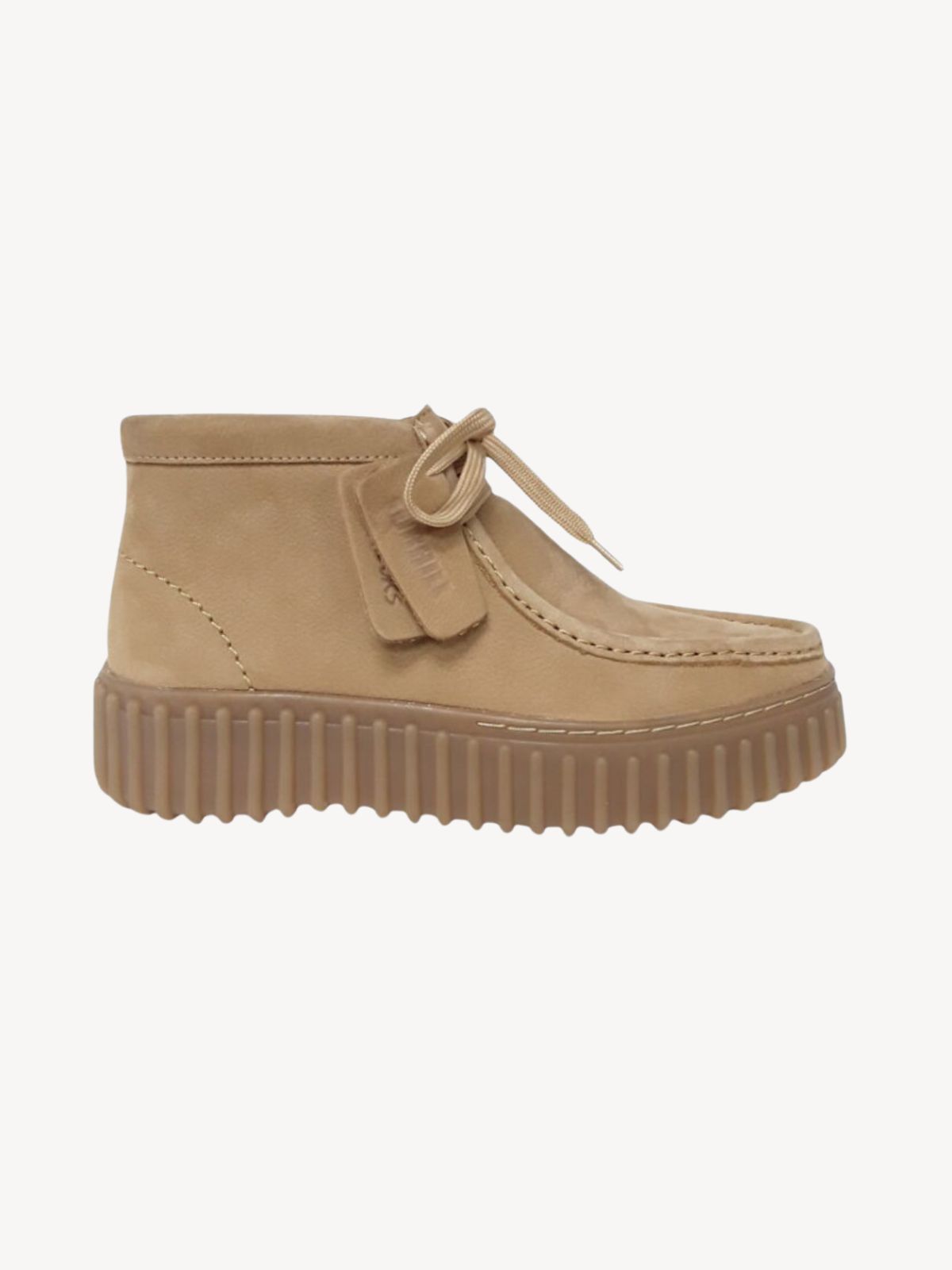 Elegant light tan nubuck snørestøvle fra CLARCKS med moccasin syning på fronten. Nem at komme i med snørebånd. Skoen har en rigitg god inder sål med masser støtte, så foden hviler godt i støvlen. God til daglig brug og passer til det meste i gaderoben. Kraftig gummisål med logo.