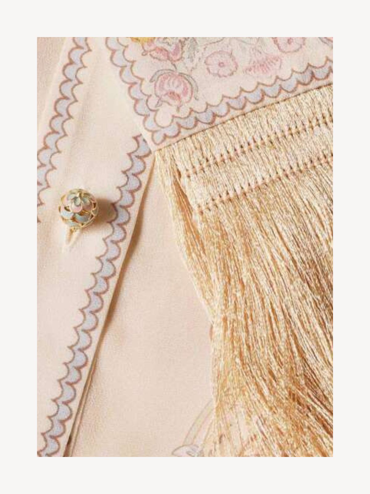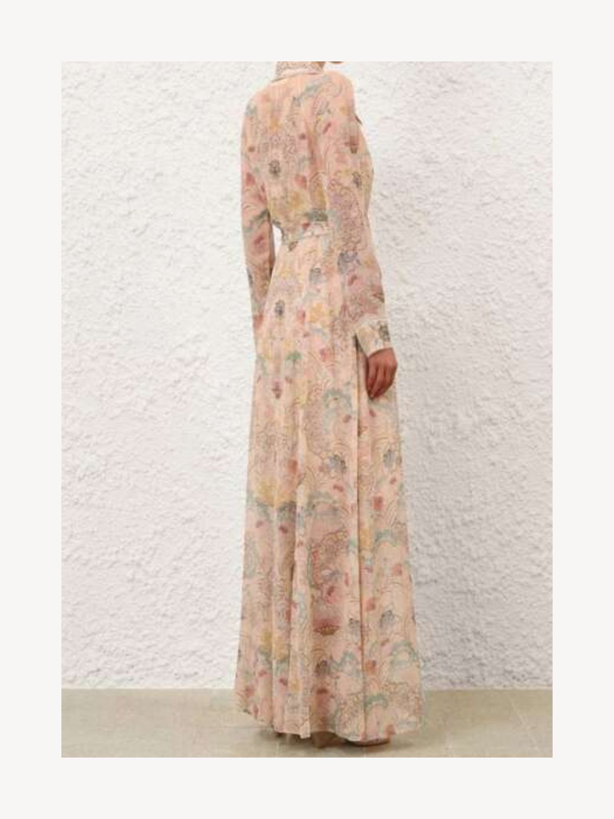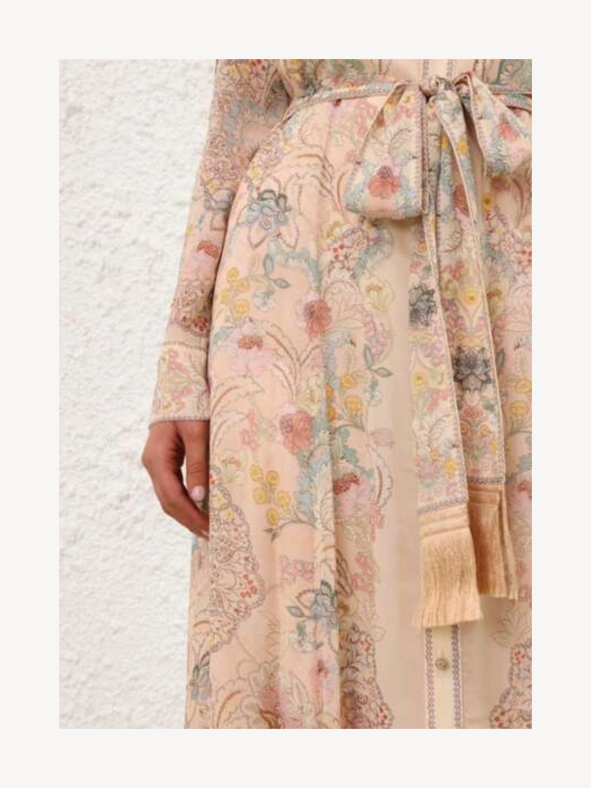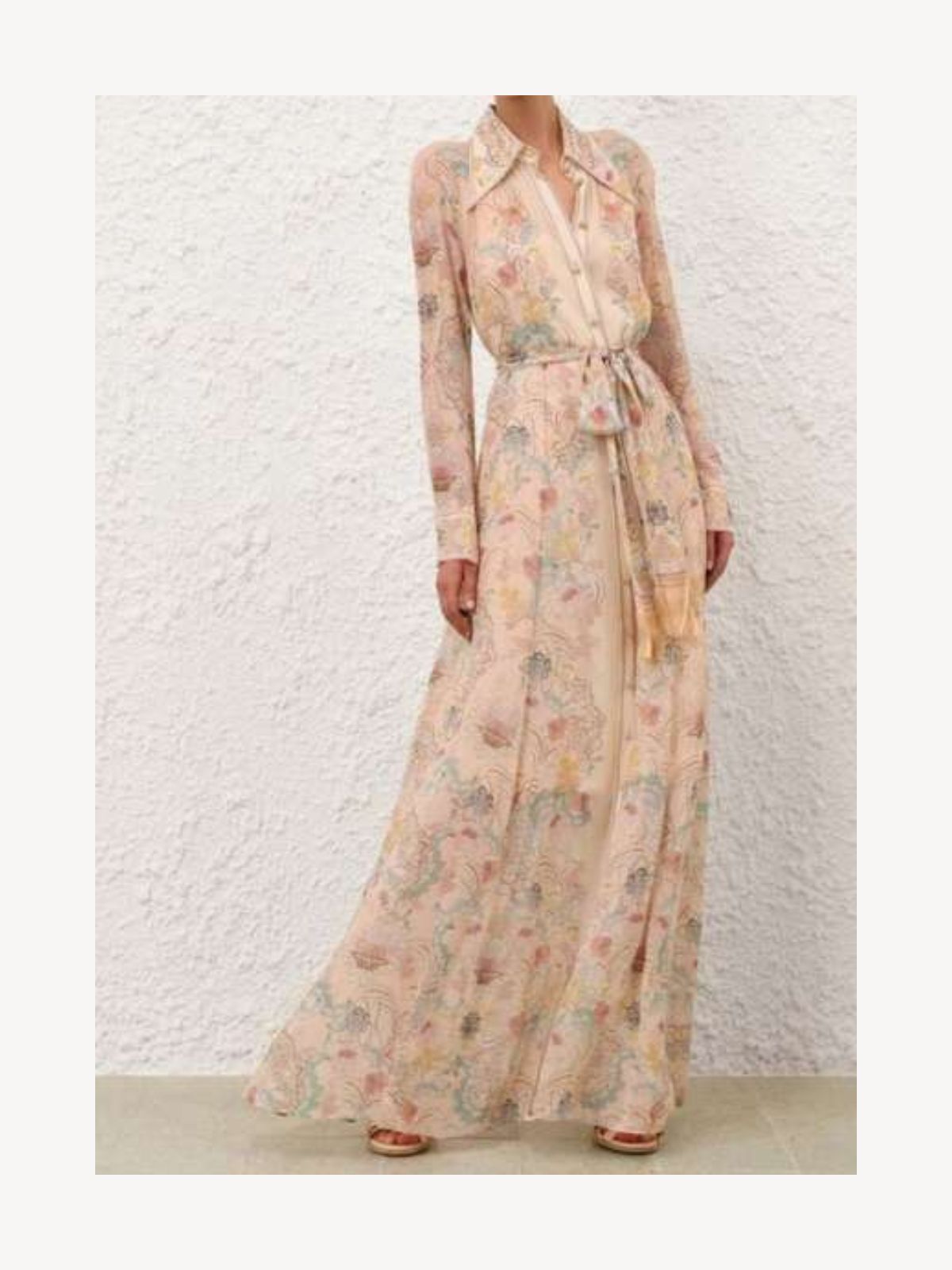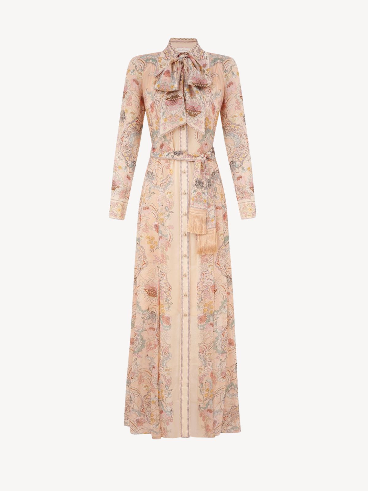 Eksklusiv Rebellion Pussybow kjolen fra ZIMMERMANN i pink blomsterprint i Twisted Romance. Kjolen er en langærmet maxikjole med en klassisk krave med pussybow-udskæring med lange flipper og smukke knapper ned langs midten foran. Kjolen har et løst bindebælte med fine guld frynser samt tilhørende underkjole.