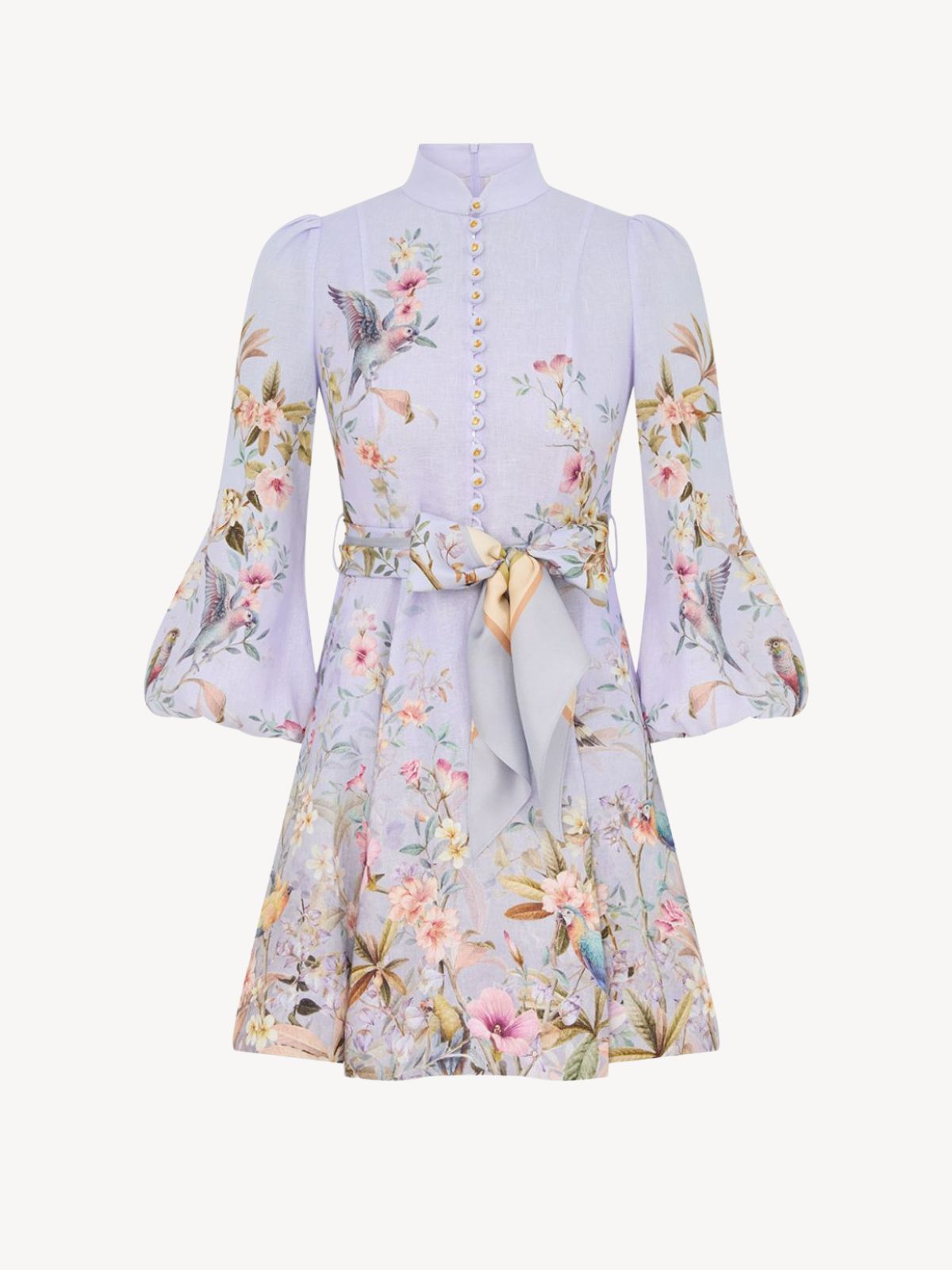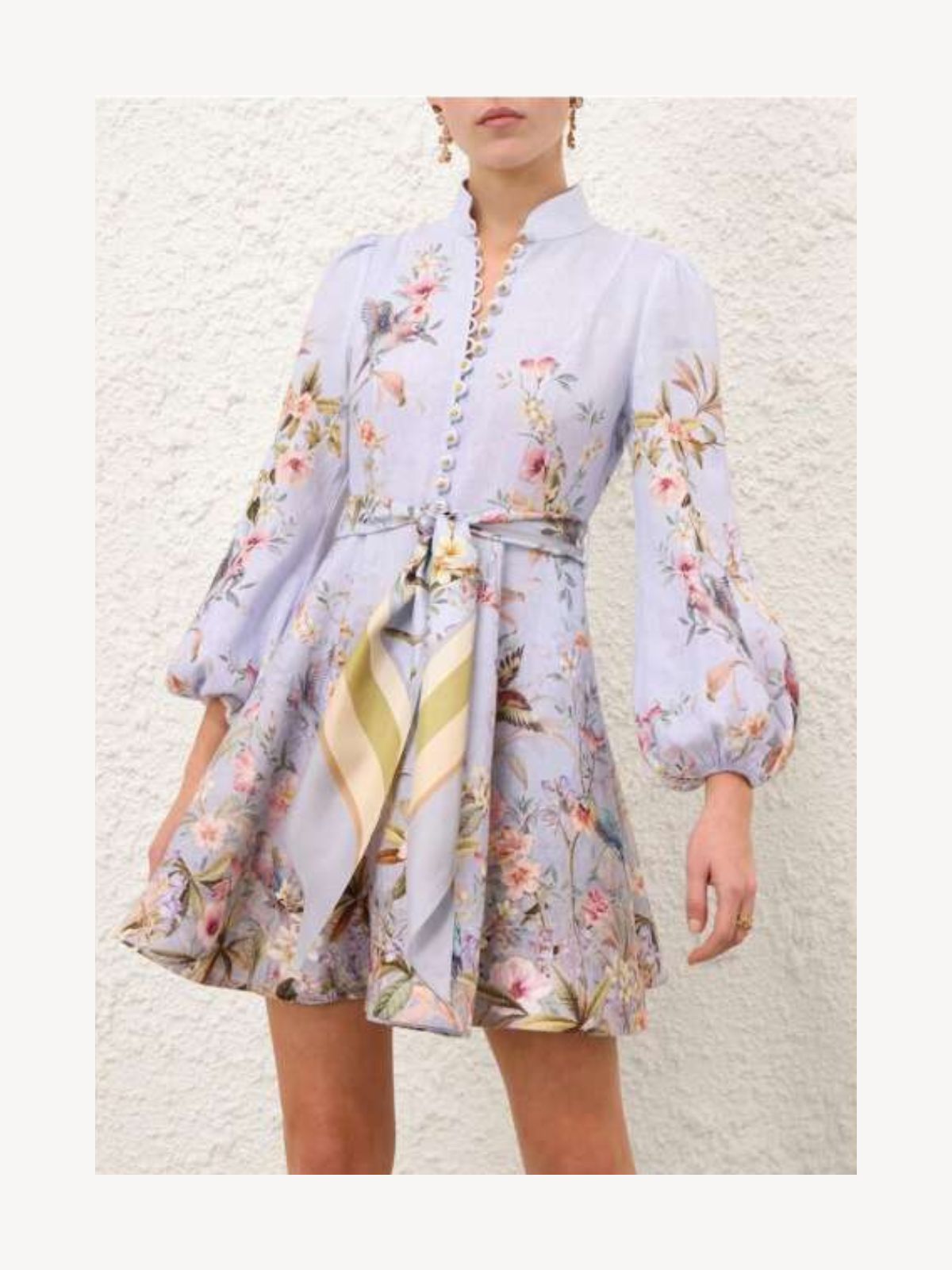 Rebellion Button Mini-kjolen fra ZIMMERMANN i Blue Aviary floral mønster i Twisted Romance. Minikjolen i hør har lange blouson-ærmer med elastiske manchetter, funktionelle rouleau knapper foran og et aftageligt tørklædebælte i silke. Kjolen høj hals samt en smuk taljering for den flotte silhouette samt skjult lynlås lukning i ryggen. En kjole til både hverdag og til festlige anledninger!