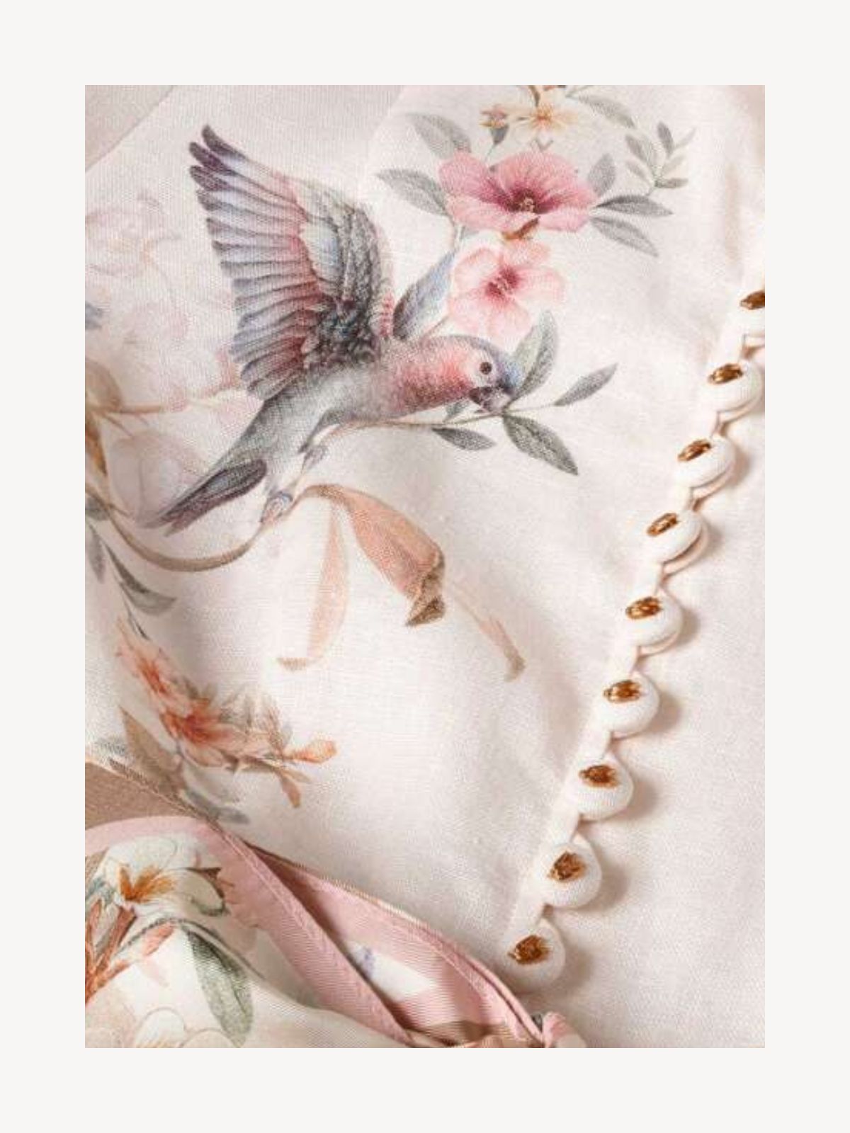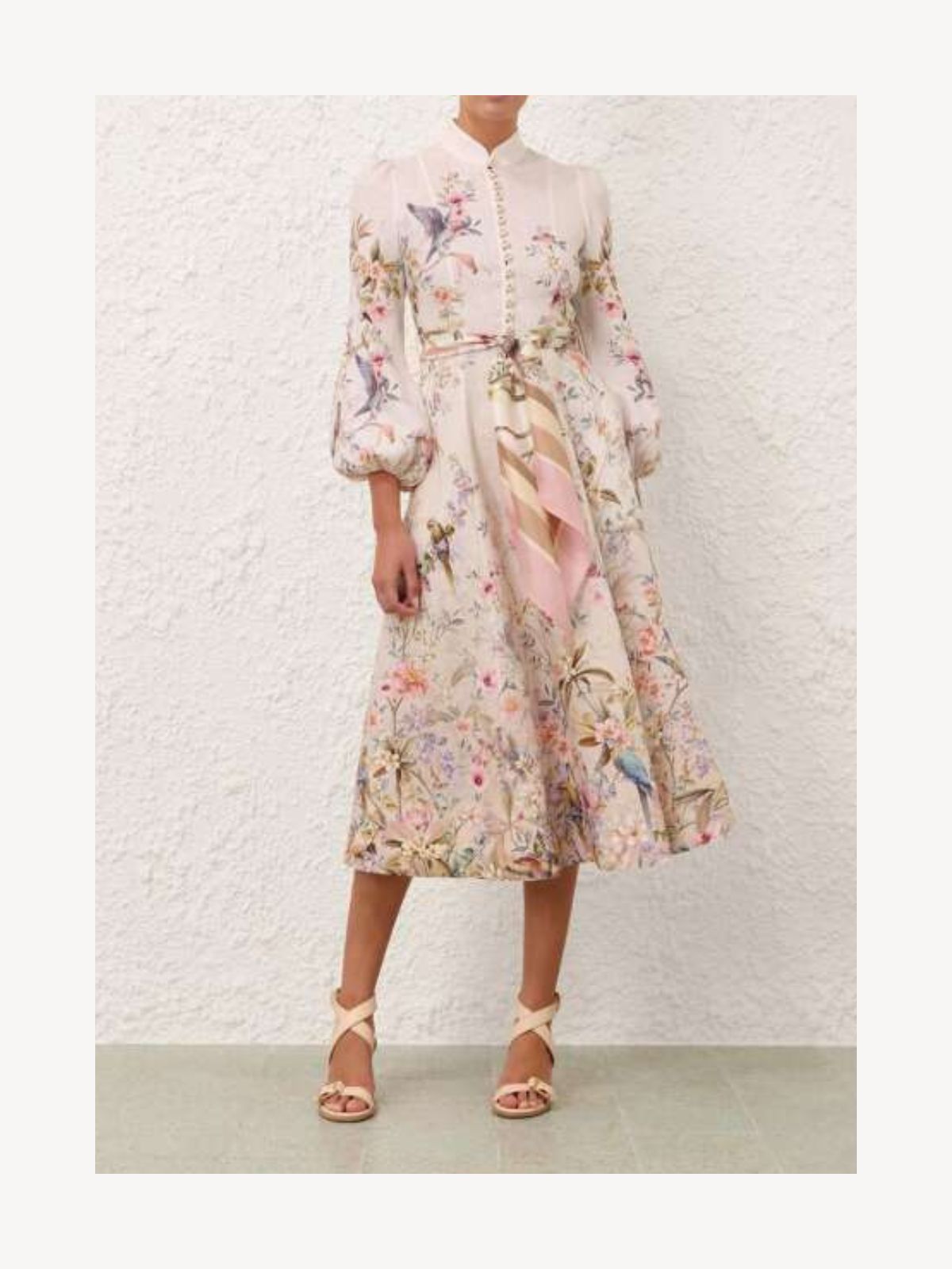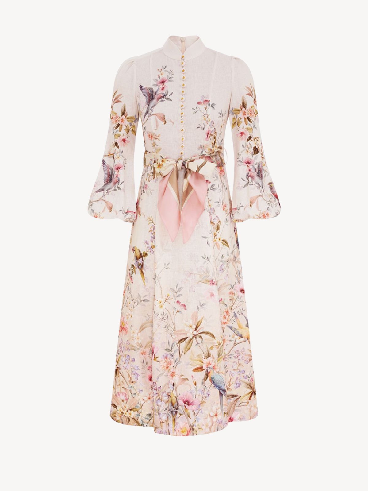 Rebellion Button Midi-kjolen fra ZIMMERMANN i Cream Aviary Twisted Romance print i smukke farver. En midi-kjole i hør med lange blouson-ærmer med elastiske manchetter, høj krave samt funktionelle rouleau knapper foran og et aftageligt tørklædebælte. Skjult lynlås lukning bagpå