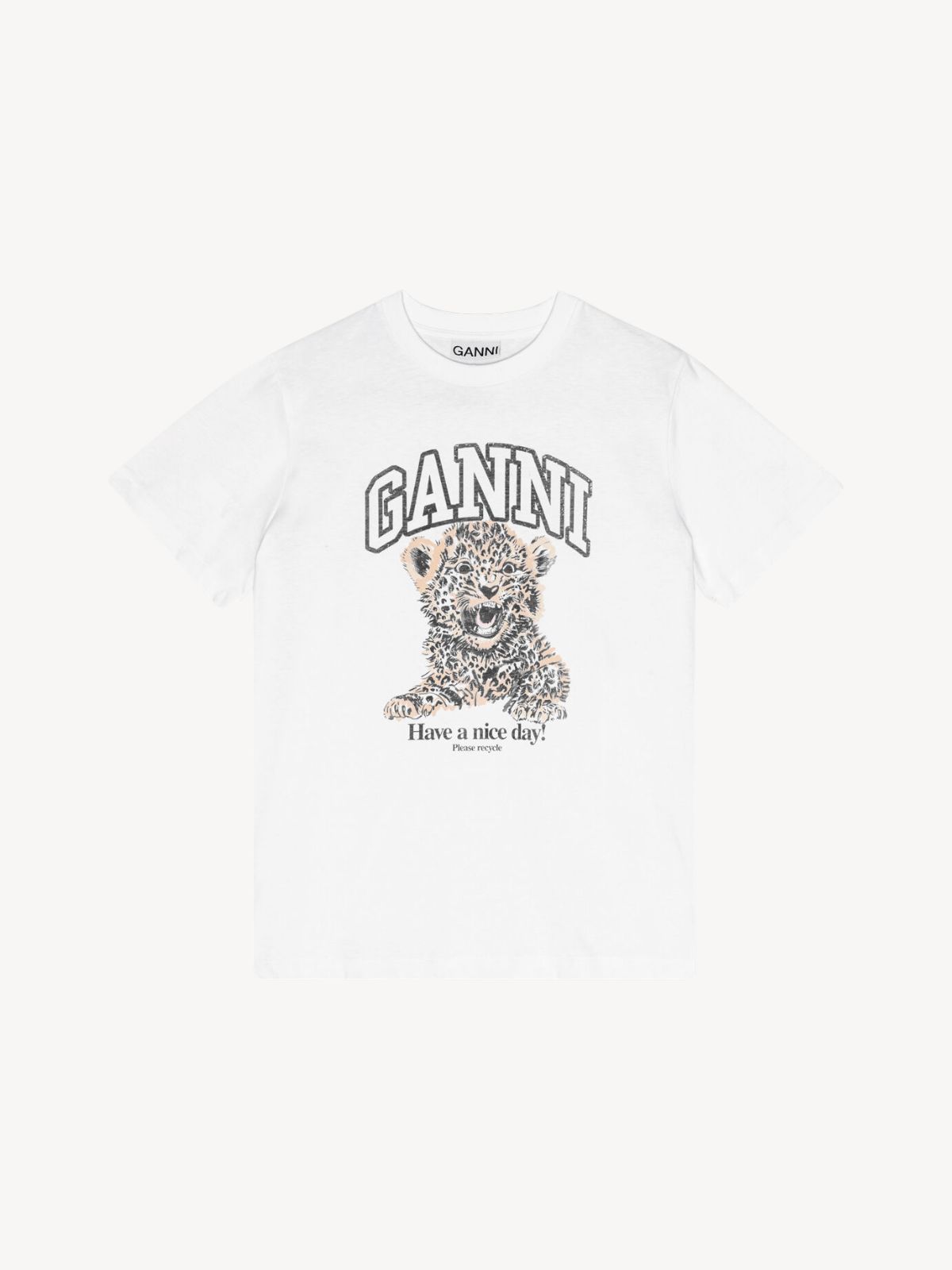 En hvid T-shirt fra GANNI med et cool leopardprint, der giver et legende og moderne udtryk. Modellen har en løs pasform, rund hals og korte ærmer, hvilket gør den både komfortabel og nem at style til hverdag. Det grafiske GANNI-print fuldender looket med et ikonisk twist.