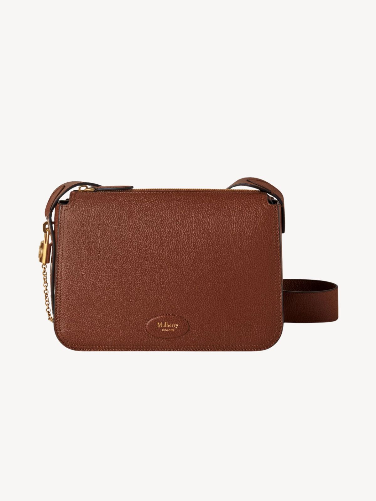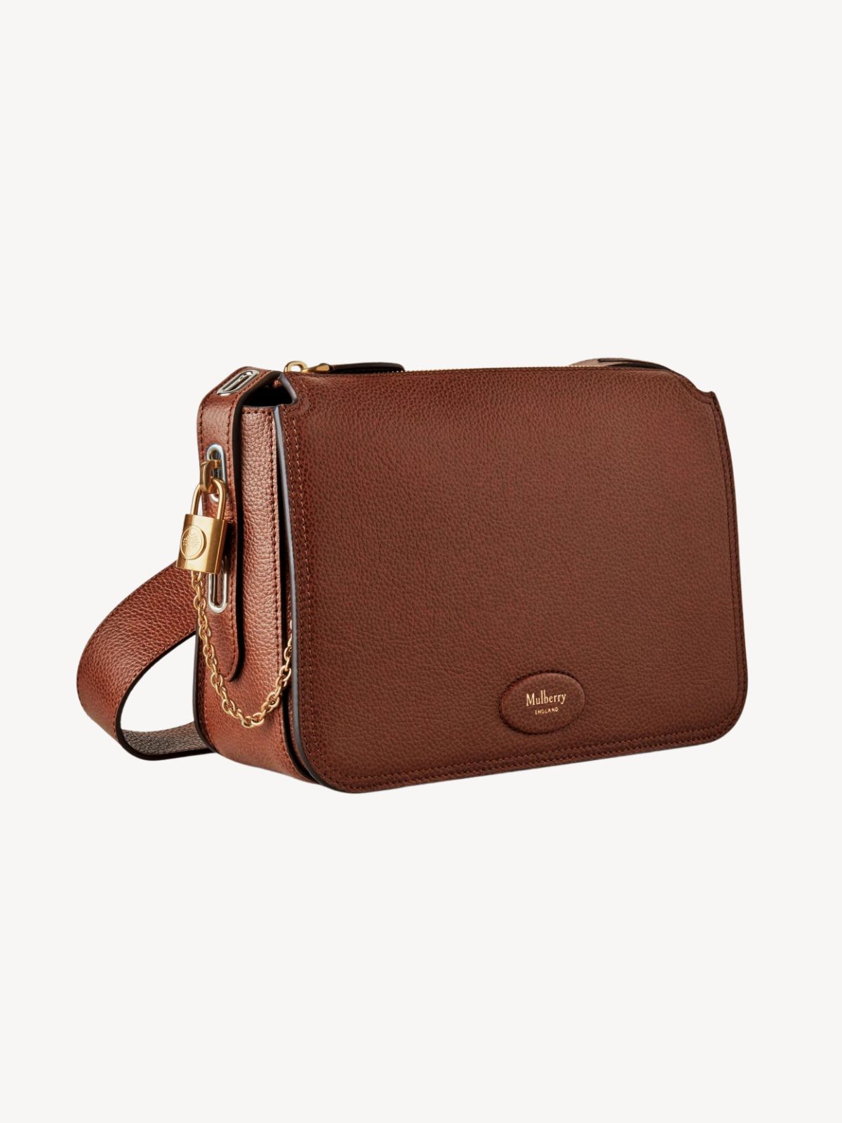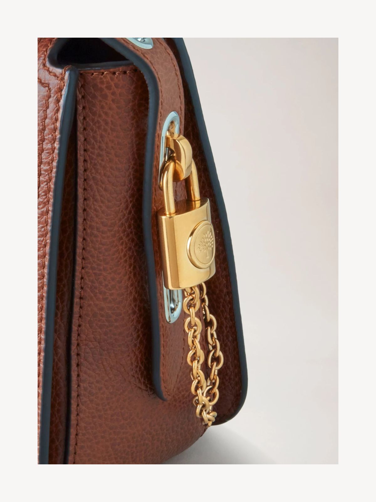 Signaturdetaljer: Padlock med kædedetalje og læderpatch med foliepræget Mulberry-logo