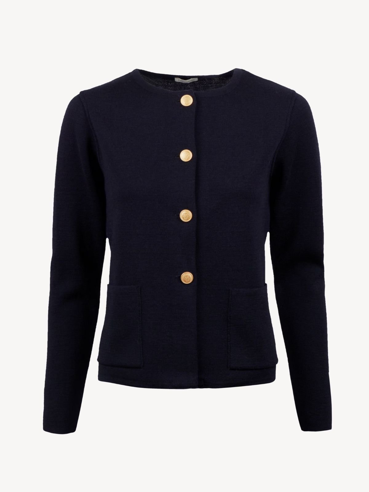 Eksklusiv cardigan fra Stenstrøms. Cardiganen har et tidsløst design, rund halsudskæring, lommer på fronten og flotte gyldne knapper.