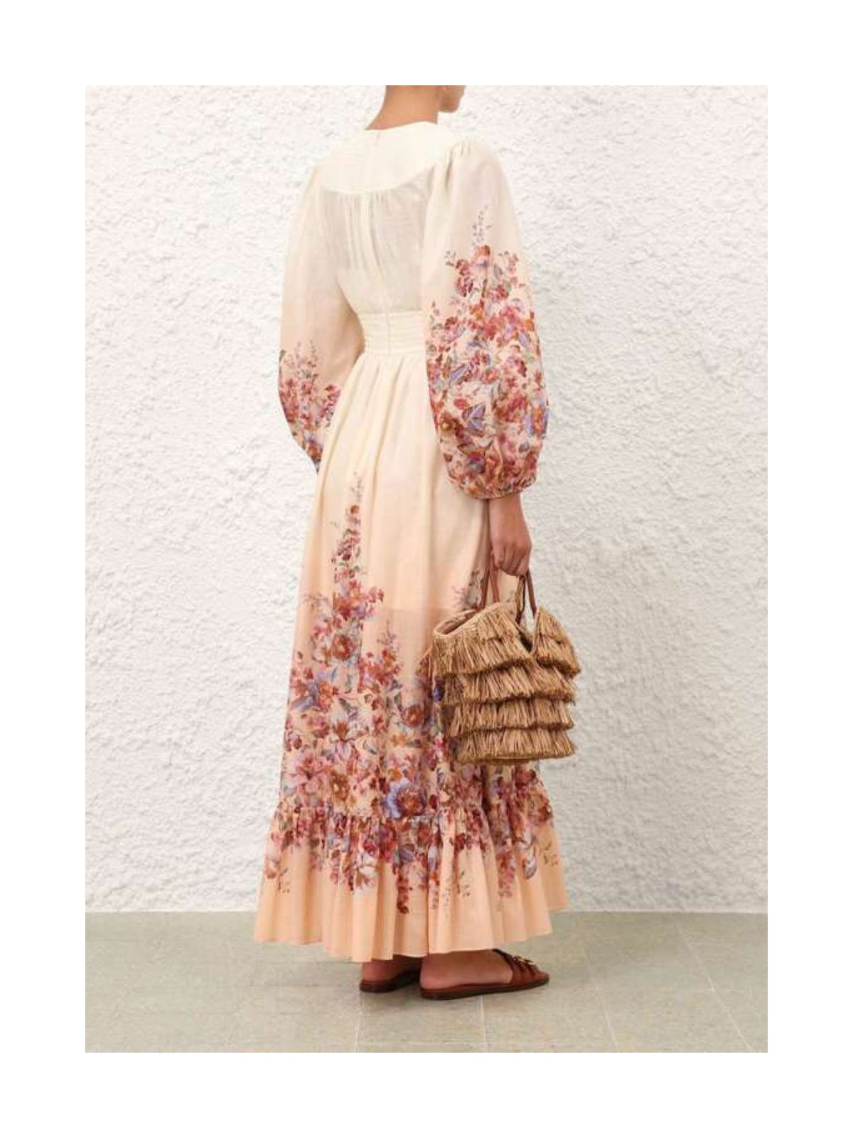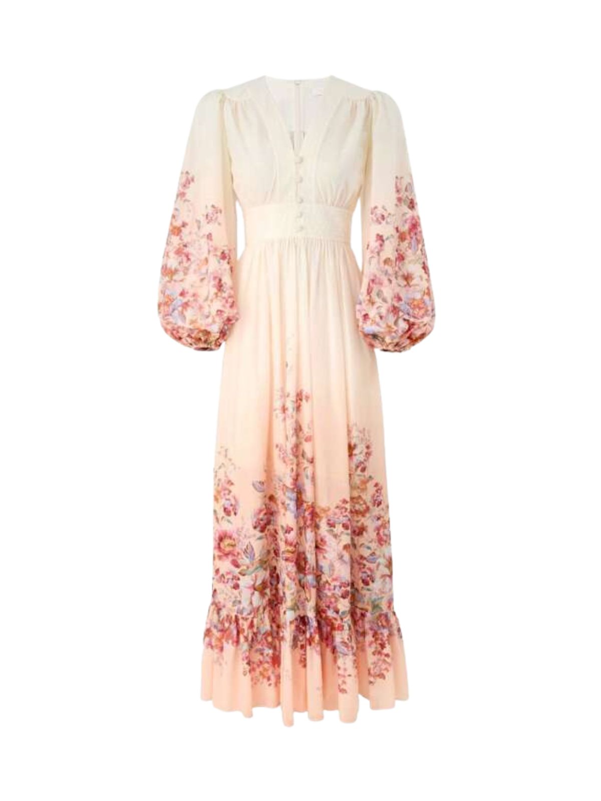 Henrivende AWAKEN PLUNGE maxi kjole fra ZIMMERMANN i smukt flora print. Kjolen har en dyb V-formet udskæring, imponerende lange ballonærmer med elastisk manchet samt blomster knaplukning, flot talje markering med draperinger for den flotte vidde i skørtet. Underkjole følger med. En elgenat kjole til særlige begivenheder!