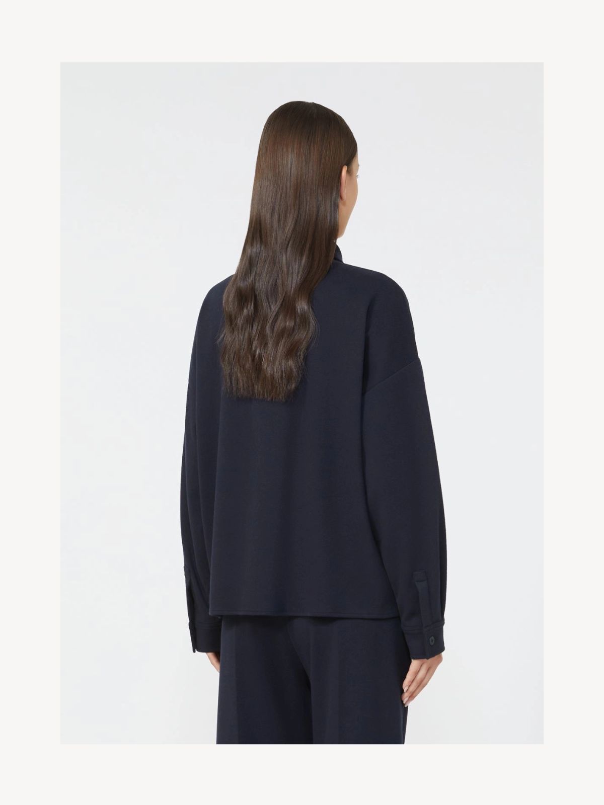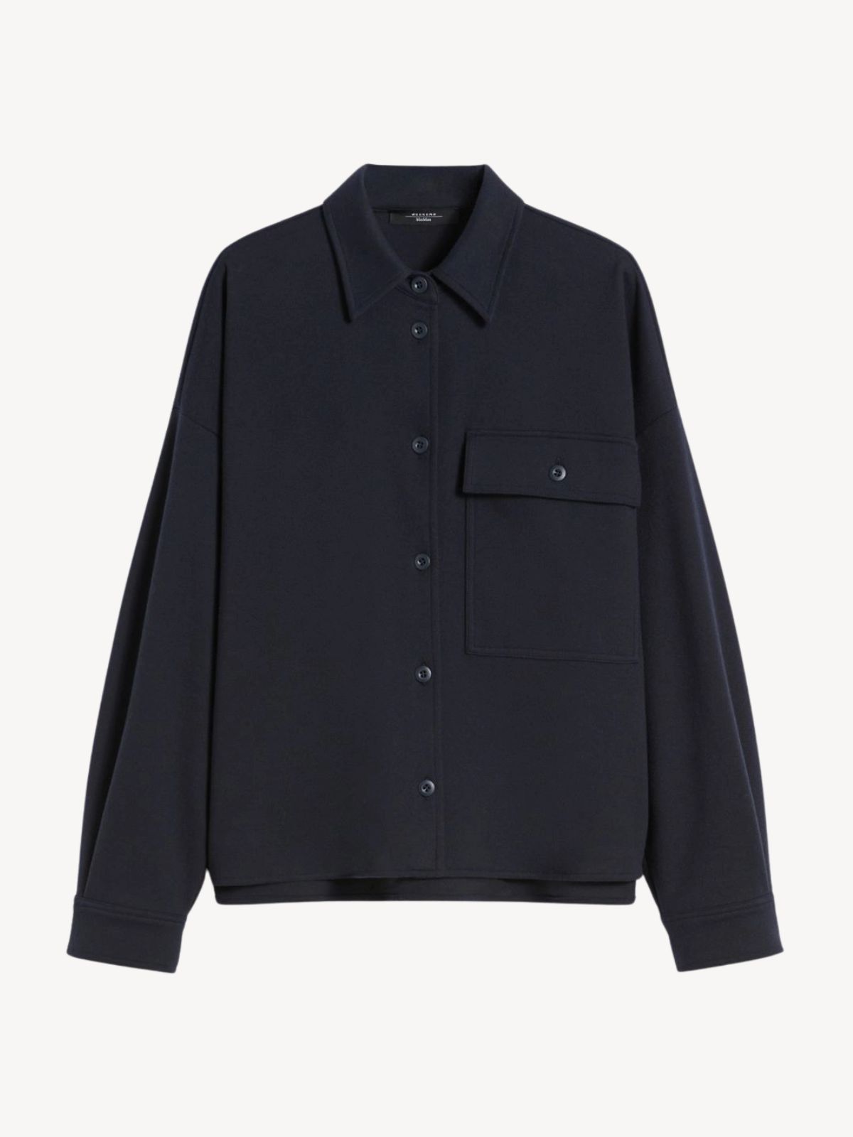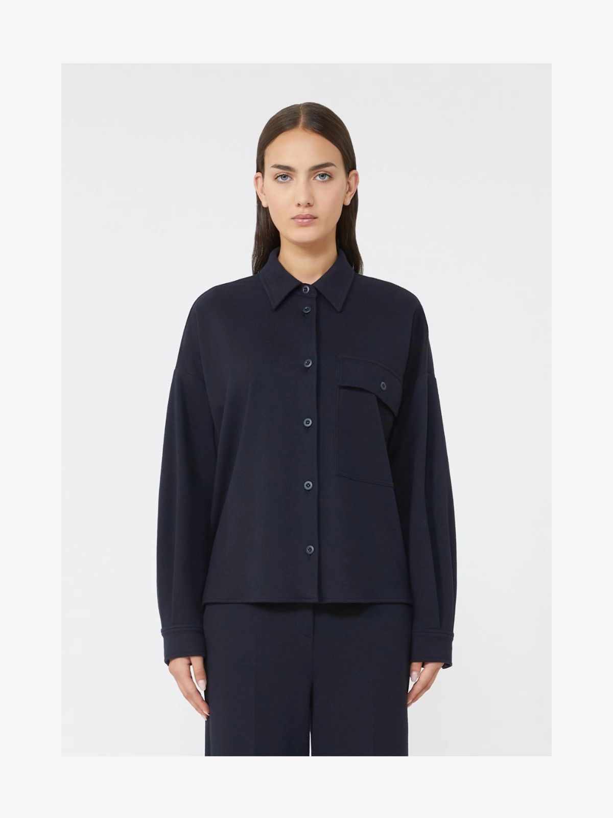 Kort skjortejakke i boxy pasform fremstillet i blød flanneljersey med bomuldsblanding. Jakken har skjortekrave, lange ærmer med sænkede skuldre, knaplukning foran samt brystlomme med klap og knap. Bagsiden er let længere med lige sideslidser, hvilket giver et moderne snit.