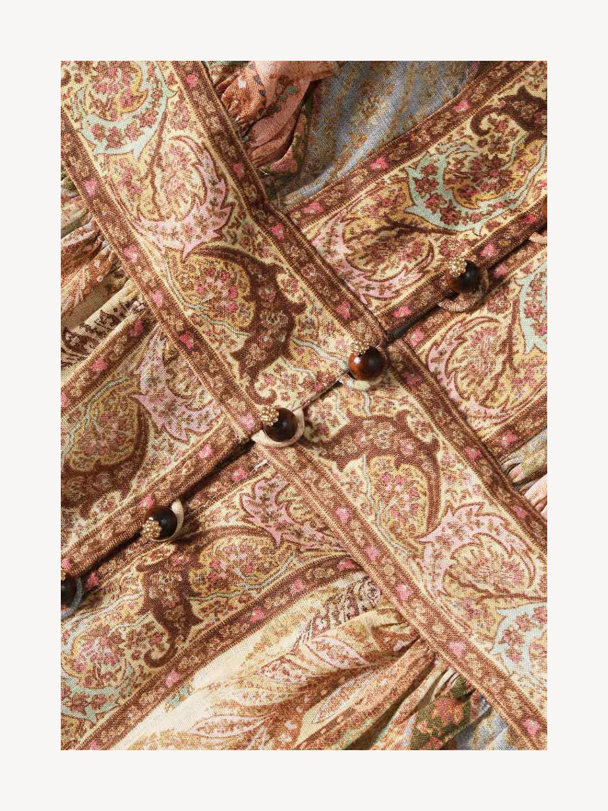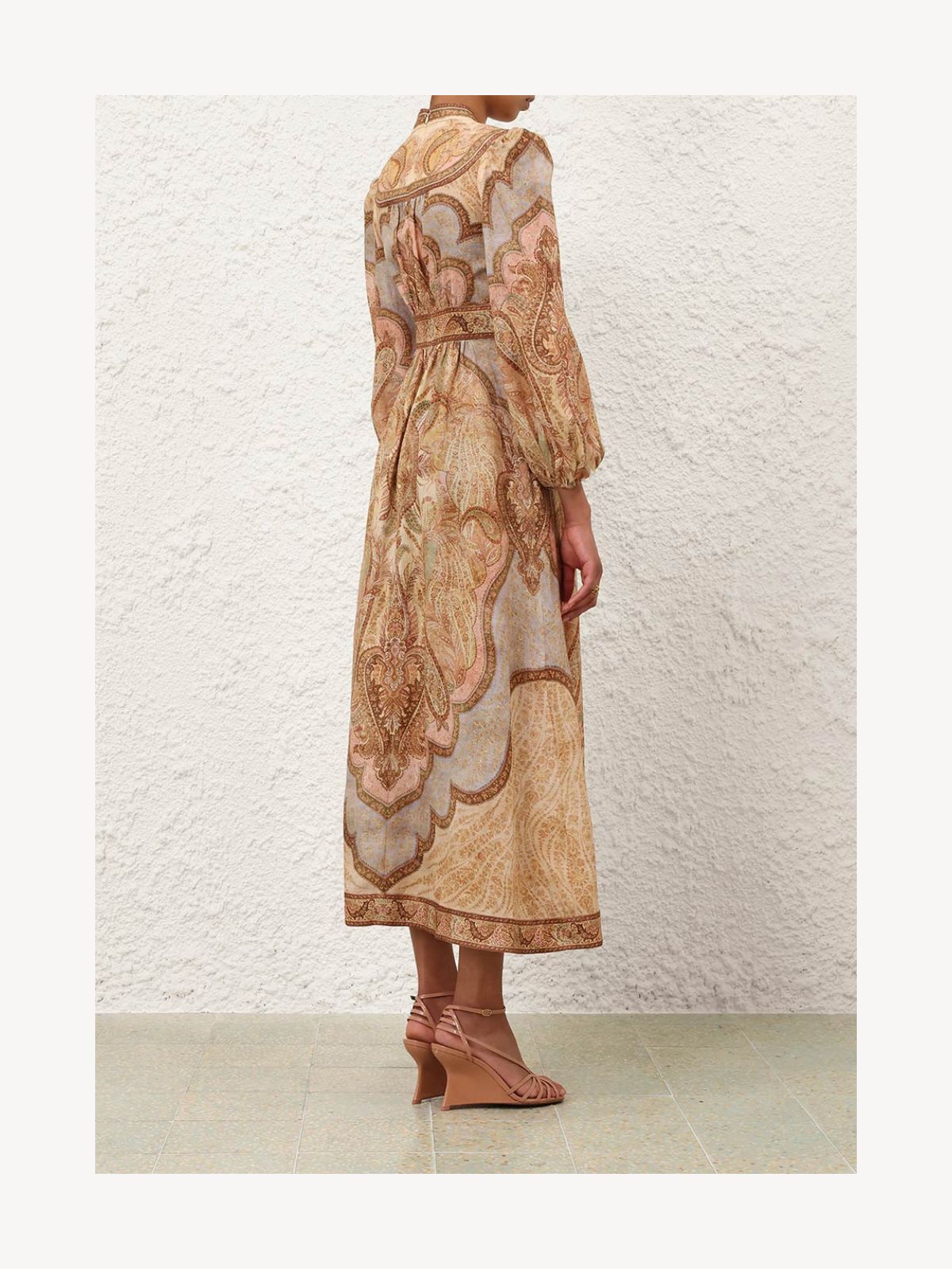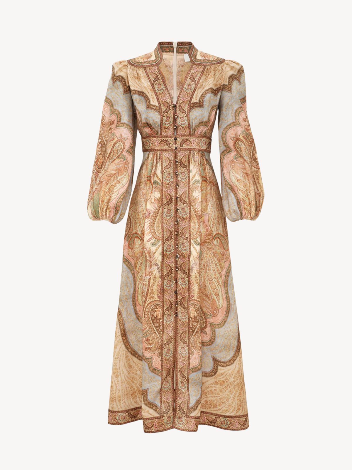 Wanderlust Plunge Midi-kjolen fra ZIMMERMANN i Tapestry Multi dessin med et fantastisk mønster. Mida kjole er i hør med dyb V-udskæring, lange elegante ballon ærmer med elastiske manchetter, en tætsiddende. linning og et svaj i nederdelen. Kjolen har en skjult lynlås lukning i ryggen, dekorative Rouleau-knapper midt foran Rouleau knapper hele vejen ned foran. Kjolen er foret.