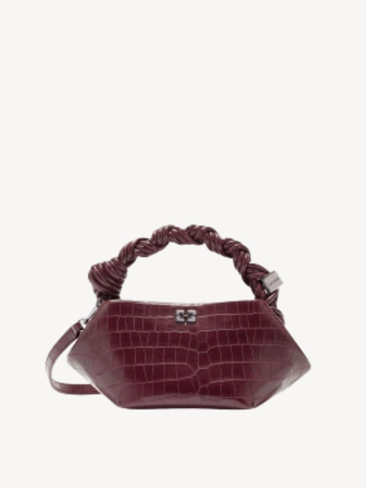 Stilfuld GANNI-taske med karakteristisk krokodilletekstur og metallisk GANNI Butterfly-logo. Designet med flettet hank med knude, justerbar og aftagelig skulderrem samt en elegant metaldetalje med indgraveret logo. Tasken lukkes med trykknap og har ét rummeligt hovedrum – perfekt til både hverdag og aften.
