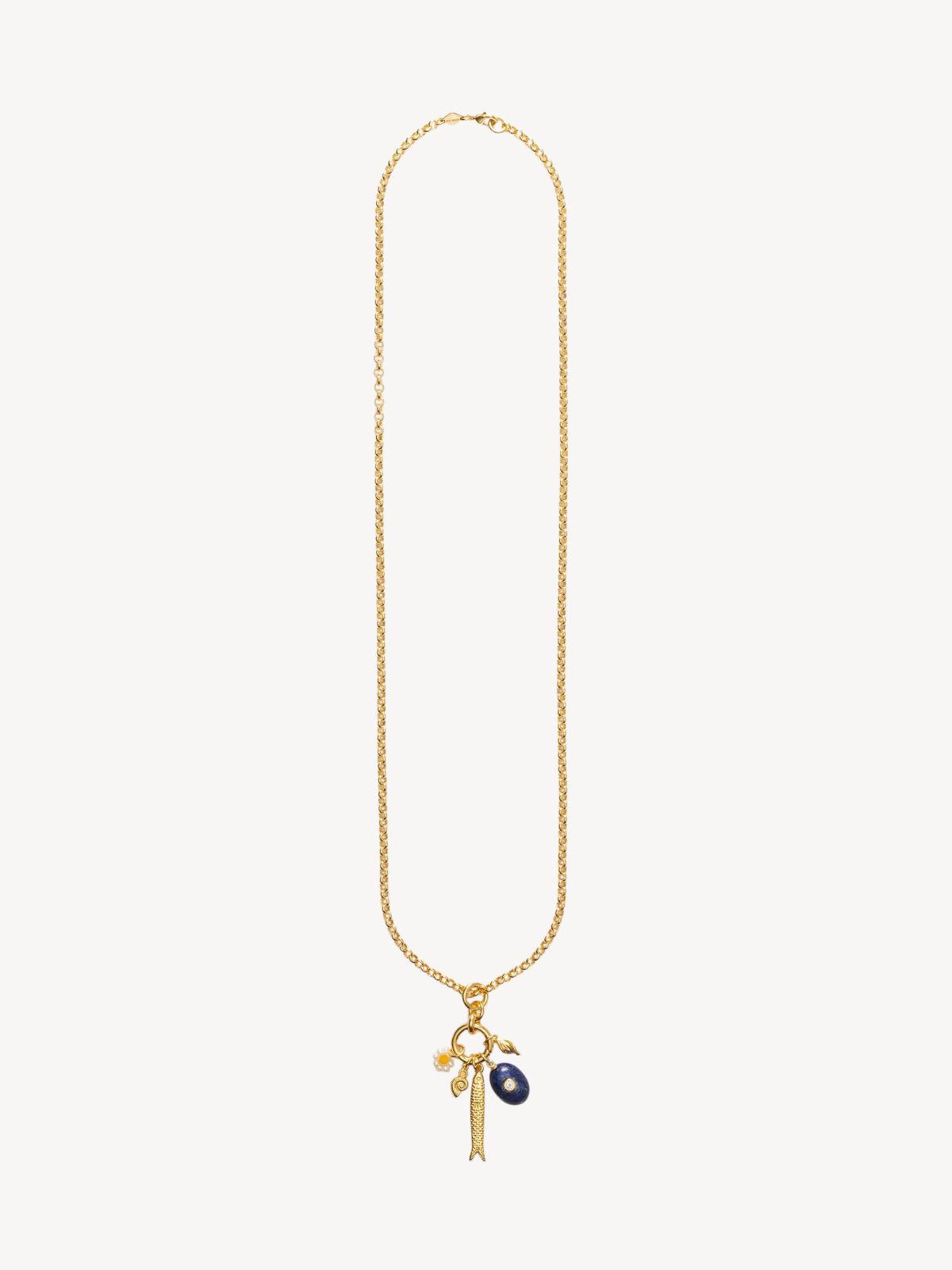 SWIMCLUB halskæden er en drømmende, legesyg tilføjelse til enhver stil — perler, lapis og gyldne detaljer flettes sammen i en eklektisk og elegant komposition.