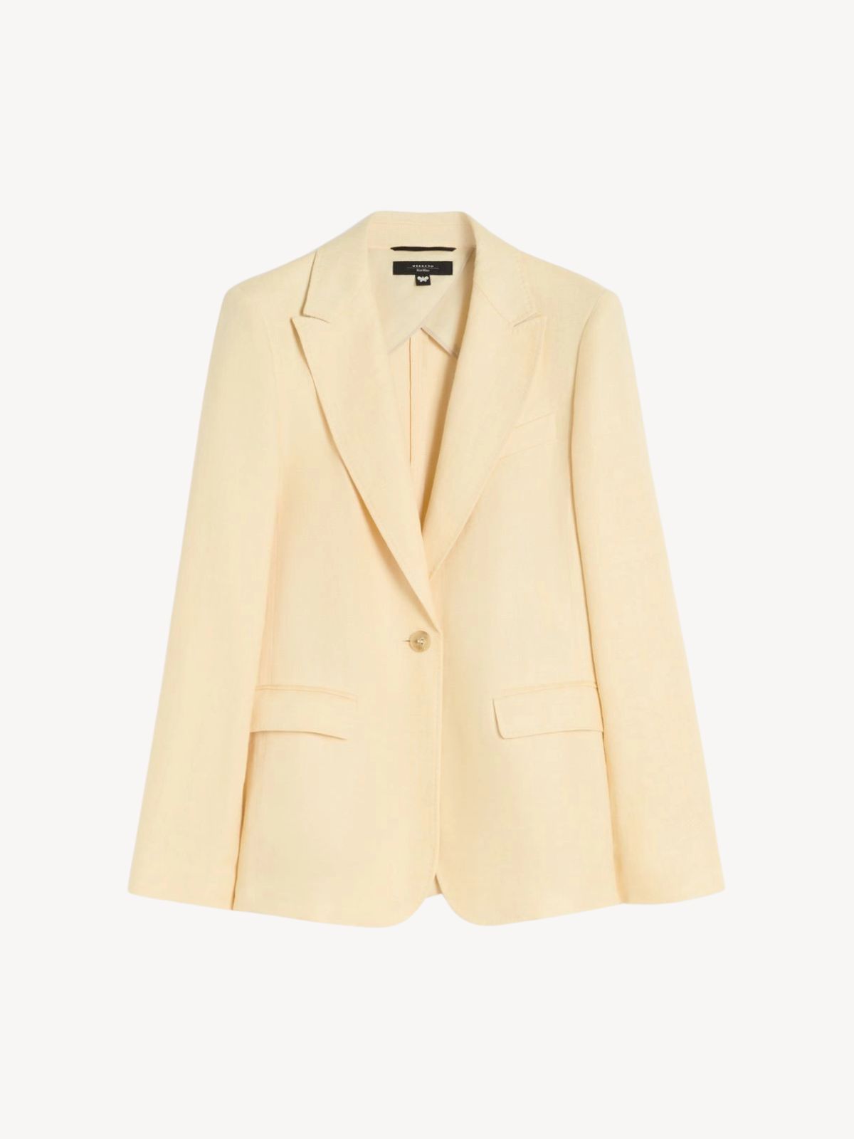Max Mara single-breasted blazer i ren hør med delvist for. Regular fit med central slids, peak-lapel krave, lange ærmer med knapper og frontlommer med klap.
