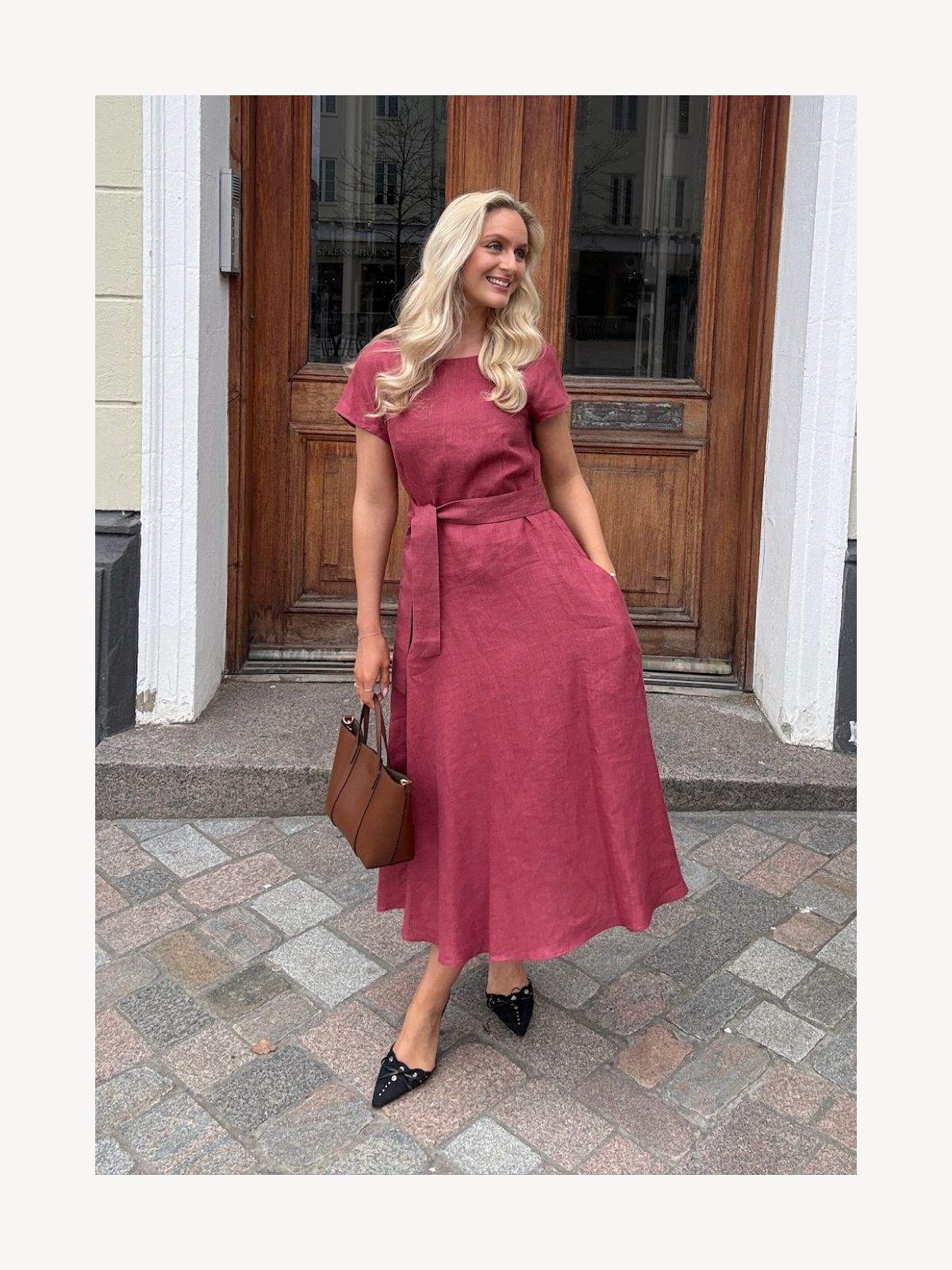 Max Mara kjole i let og åndbar 100% hør med en afslappet og elegant silhuet. Kjolen har et O-udsnit med keyhole-lukning og bindebånd, sidelommer samt tone-i-tone kviltede sømme, hvilket giver et blødt og raffineret udtryk. Den 3/4-lange længde og kvartærmede ærmer skaber en moderne, behagelig pasform, der passer til både hverdag og sommerlige anledninger.