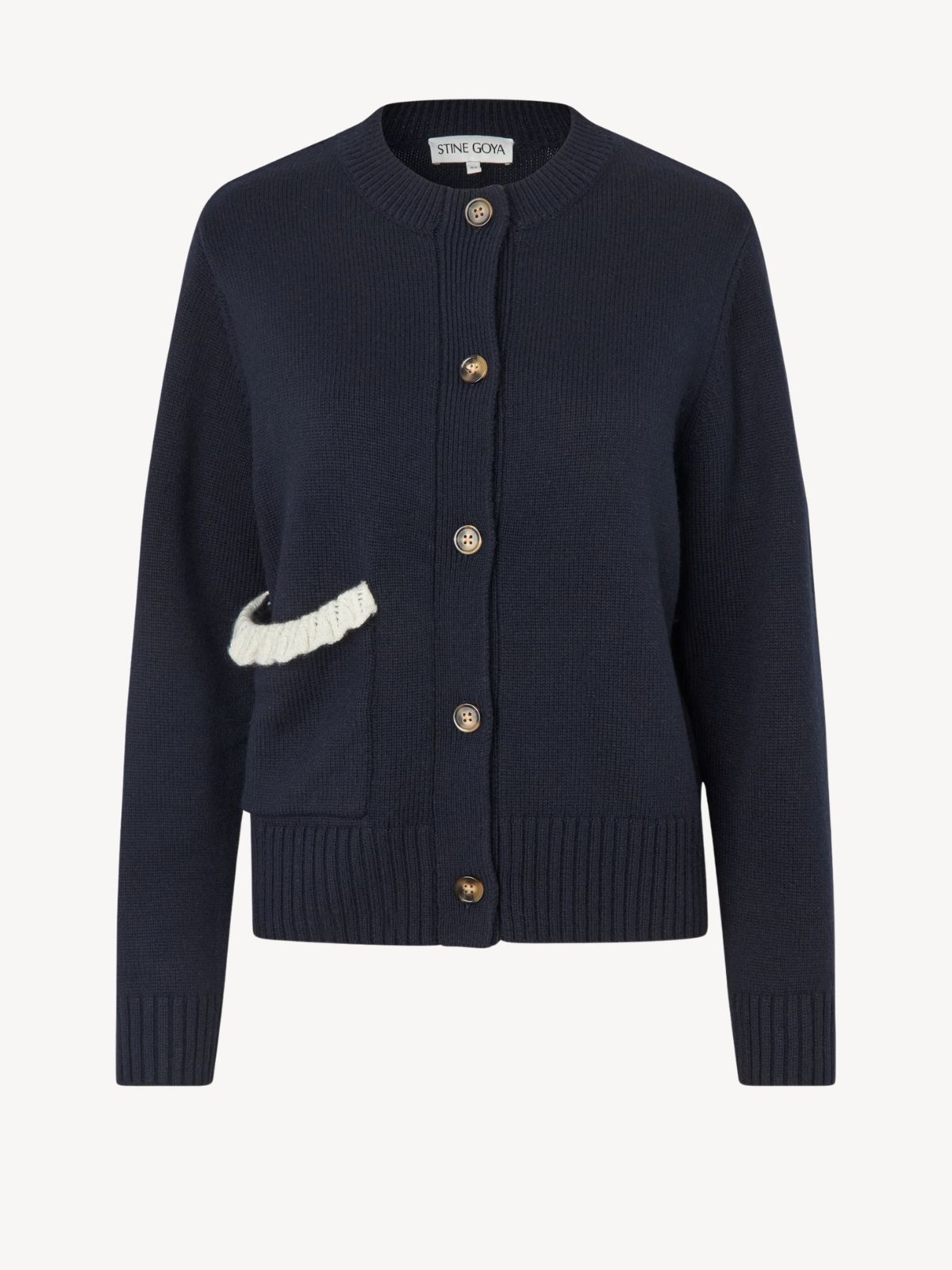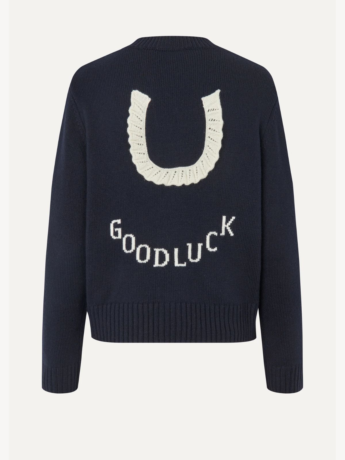 Denne mørkeblå strikcardigan kombinerer klassisk komfort med unikke, håndlavede detaljer. Den har hæklede lommer, knaplukning foran og et hæklet hestesko-motiv med 'Good Luck'-broderi på ryggen, hvilket giver et personligt og stilfuldt udtryk. Fremstillet i en luksuriøs blanding af FSC-certificeret viskose, genanvendt nylon, bomuld, merinould og kashmir, sikrer cardiganen både varme, blødhed og holdbarhed.