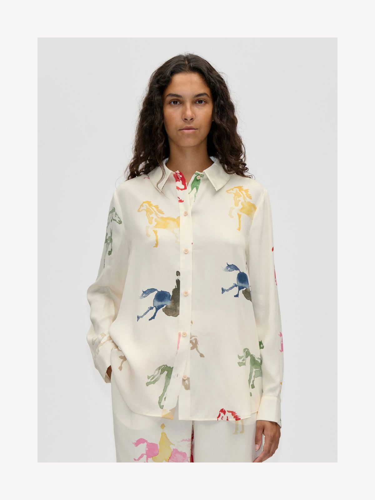 Denne offwhite skjorte kombinerer klassisk design med kunstneriske detaljer gennem det håndmalede hestemotiv. Den har en klassisk krave, gennemgående knaplukning og lange ærmer med manchetter, hvilket giver et sofistikeret og elegant udtryk. Fremstillet i en blød og let TENCEL™ Lyocell- og viskoseblanding, sikrer skjorten komfort hele dagen. Style den med de matchende bukser for et komplet og koordineret look.