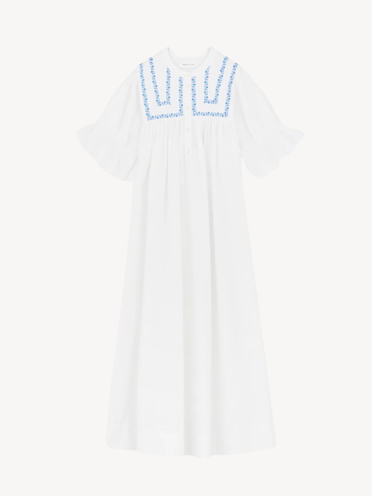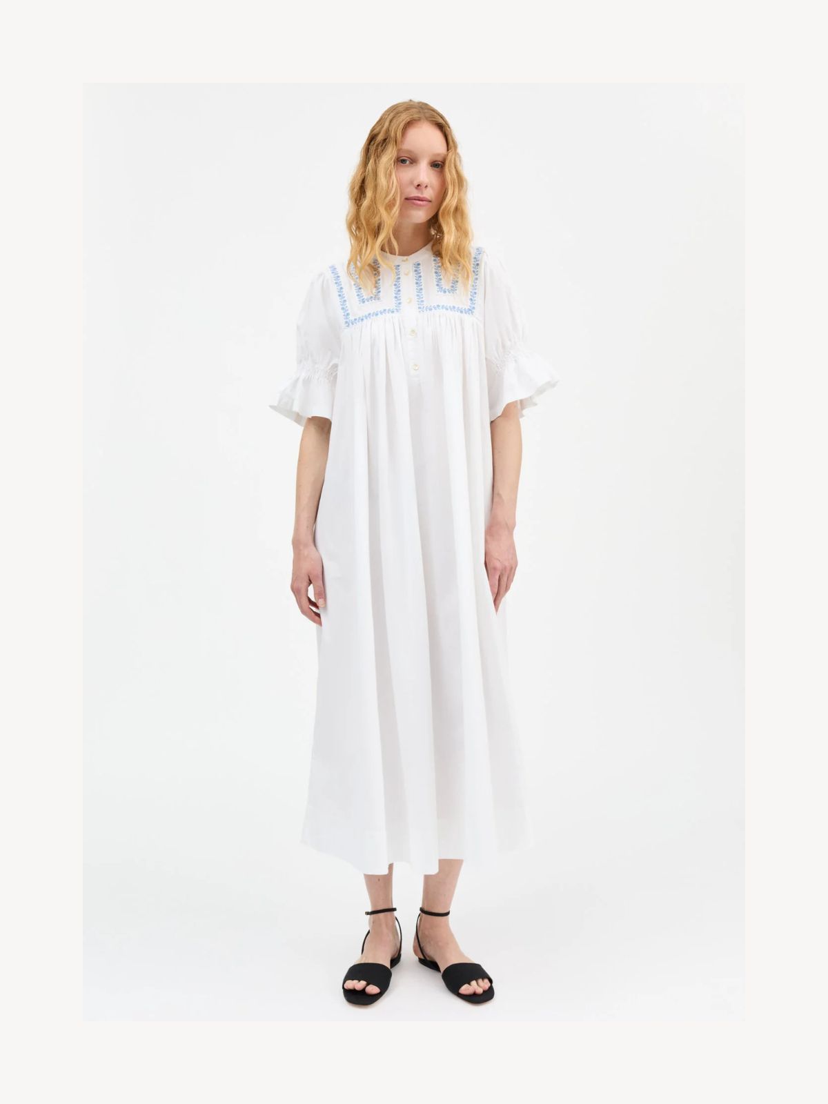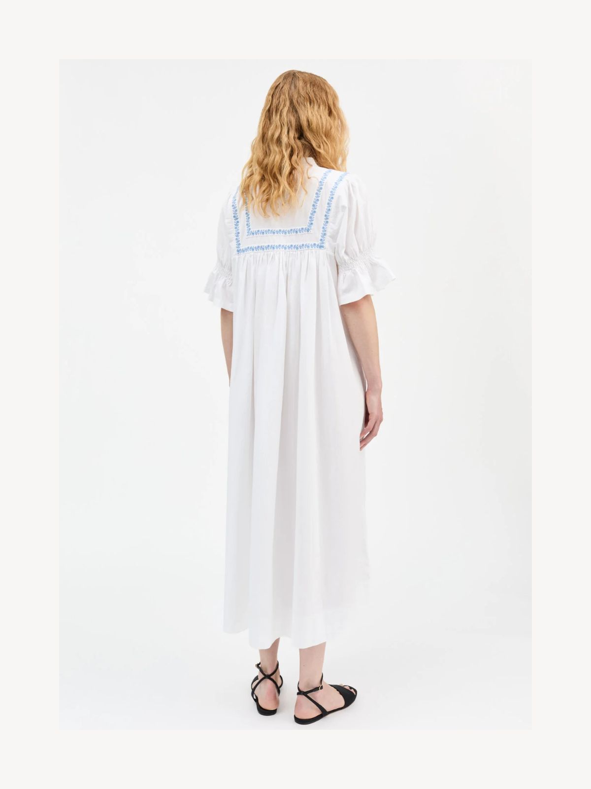 Denne vintageinspirerede kjole med broderede detaljer kombinerer romantisk elegance med afslappet komfort. Den har en rund hals med lille standkrave, korte ærmer med elastikdetalje og en løs silhuet, der skaber et behageligt og let look. Kjolen er fremstillet af 100% økologisk bomuld og er GOTS-certificeret, hvilket sikrer bæredygtig produktion. Perfekt til både hverdag og særlige lejligheder, hvor stil og komfort skal gå hånd i hånd.