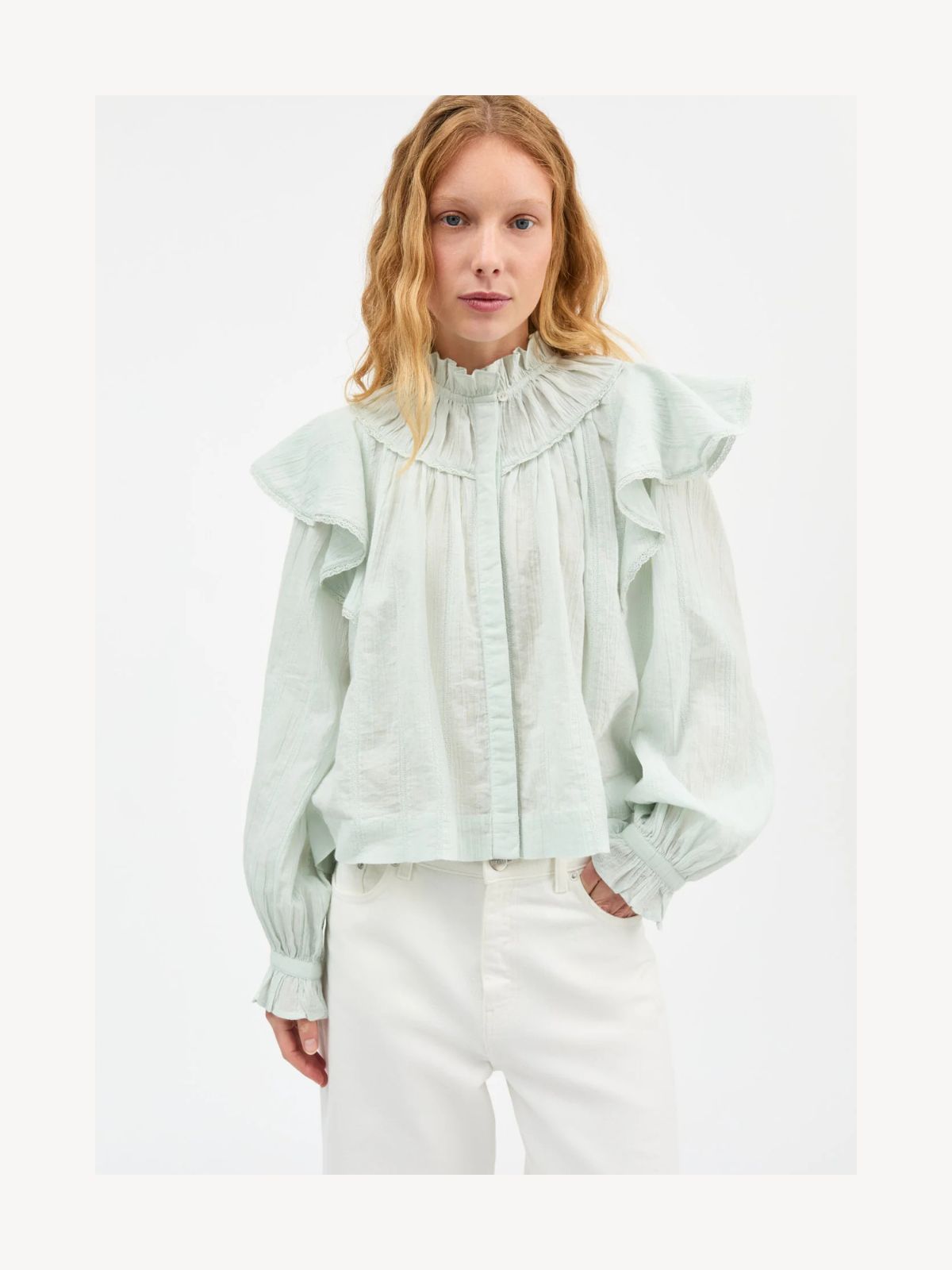 Denne flæsebluse kombinerer romantiske detaljer med klassisk design. Den har V-hals med rund flæsekrave, skjulte knapper hele vejen ned samt lange ærmer med knap og flæse, hvilket giver et sofistikeret og feminint udtryk. Blusen er fremstillet af 100% økologisk bomuld, GOTS-certificeret og produceret i Indien, hvilket sikrer både komfort og bæredygtighed.