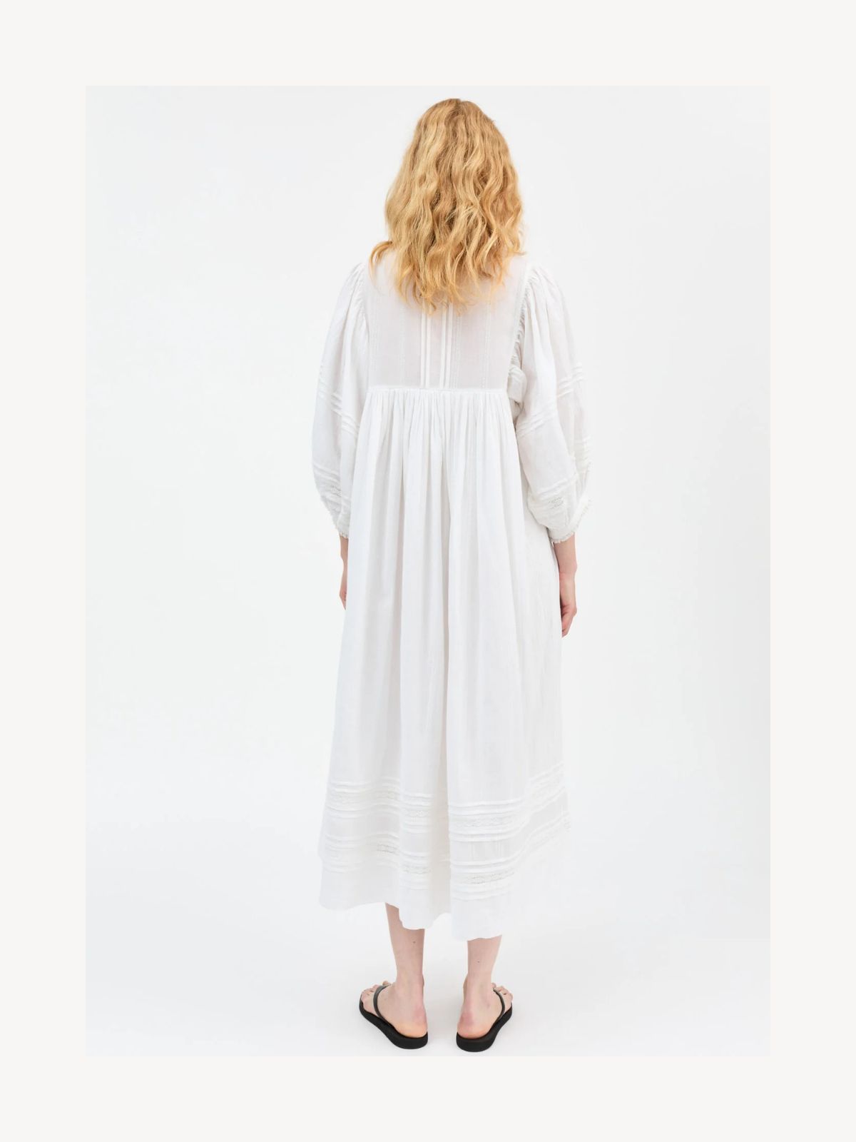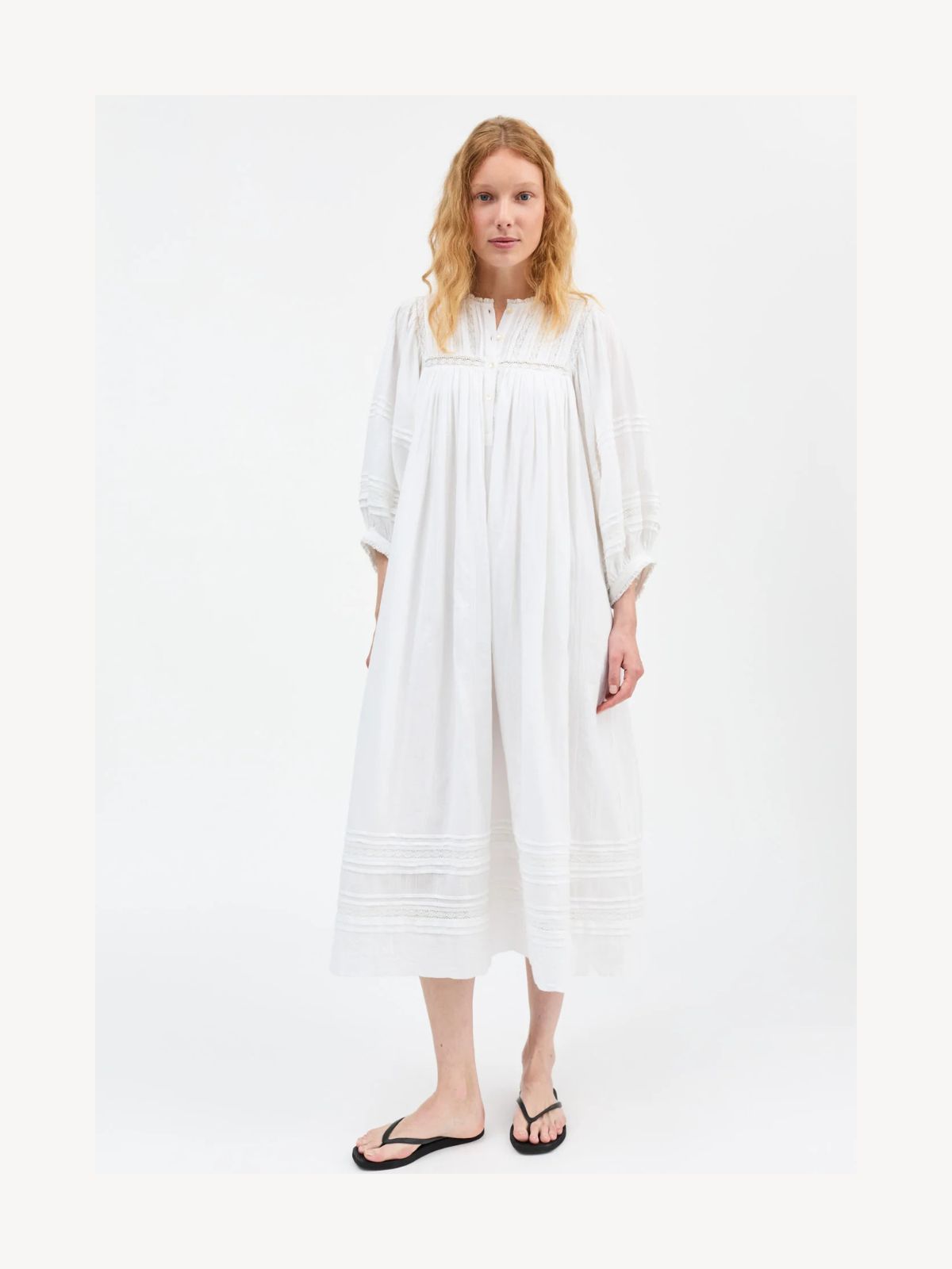 Denne lange kjole i bomuldsblonde kombinerer romantiske detaljer med en let og luftig silhuet. Den har rund hals med blondekant, lange ærmer med læg og volumen samt knappet halvvejs ned. Læg og plisseringer skaber ekstra fylde og bevægelse, hvilket giver kjolen et elegant og feminint udtryk. Fremstillet i 100% økologisk bomuld med for i samme materiale, GOTS-certificeret og produceret i Indien, sikrer den både komfort og bæredygtighed.