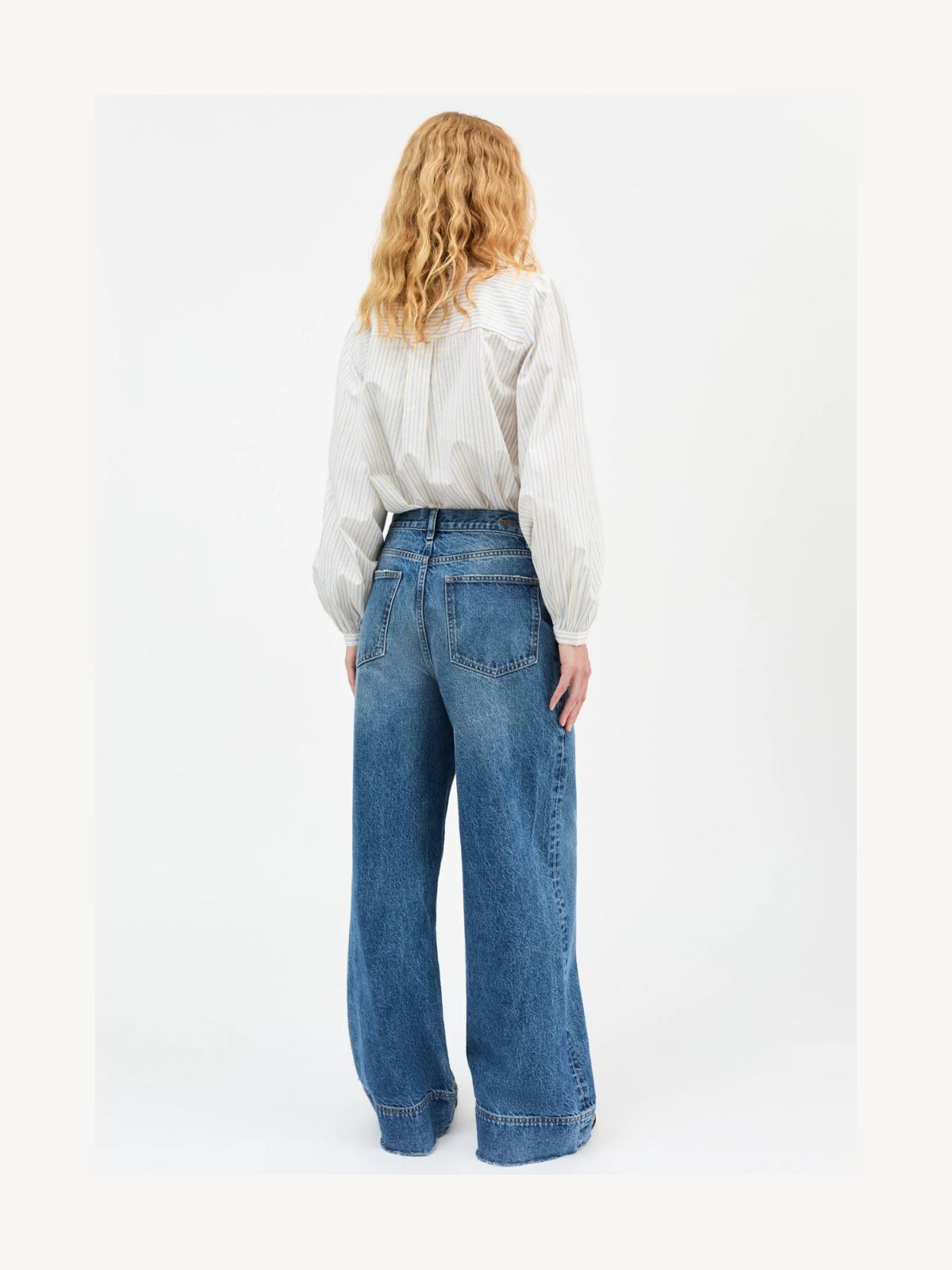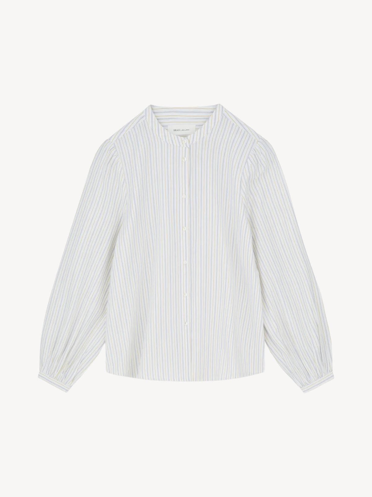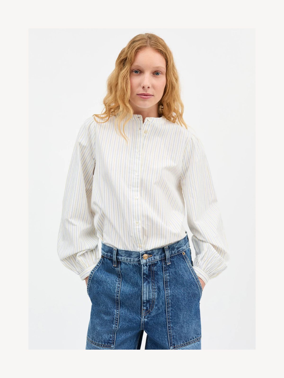 Denne skjorte kombinerer enkelhed med feminine detaljer. Den har rund hals uden krave, læg i ryggen, der skaber volumen, samt knapper hele vejen ned for et klassisk og stilfuldt look. Lange ærmer med manchetter giver ekstra finesse, mens den bløde kvalitet i 100% økologisk bomuld sikrer komfort hele dagen. Skjorten er GOTS-certificeret og produceret i Indien, hvilket gør den både bæredygtig og holdbar.
