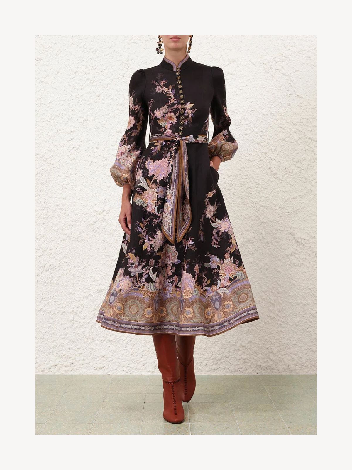 The Luna Button Midi Dress i Midnight Paisley fra Spring 2026-kollektionen, Kindred Spirit, er en elegant og feminin kjole med et sofistikeret udtryk. Den er designet i en let og åndbar hørkvalitet, der falder smukt og giver en naturlig bevægelse. Kjolen har en høj standkrave og lange ærmer med elastiske manchetter, som giver mulighed for at justere længden efter behov. De fine rouleau-knapper langs fronten tilføjer et eksklusivt touch, mens det aftagelige tørklædebælte i silke fremhæver taljen og skaber en flatterende silhuet. Den flared nederdel giver kjolen et let og feminint fald, og det diskrete lynlås i ryggen sikrer en elegant lukning. Det gennemførte paisley-print er nøje placeret for et unikt og harmonisk look.