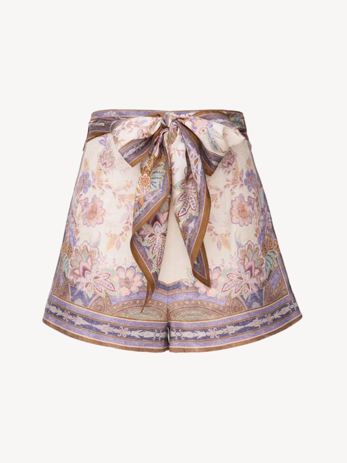 Luna Scarf Tie Shorts i Cream Blue Paisley fra Zimmermann er et par elegante og feminine shorts med et let og sommerligt udtryk. De er fremstillet i en luftig hørkvalitet, der føles behagelig mod huden og giver et smukt, naturligt fald. Den højtaljede pasform fremhæver taljen og skaber en flatterende silhuet, mens det aftagelige tørklædebælte tilføjer et raffineret og personligt touch. Shortsene lukkes diskret med lynlås bagpå og har praktiske sidelommer samt en fuldt foret inderside, der sikrer komfort hele dagen. Det fine paisley-mønster i creme og blå nuancer gør dem nemme at style – både med den matchende bluse eller en enkel top for et mere afslappet look.