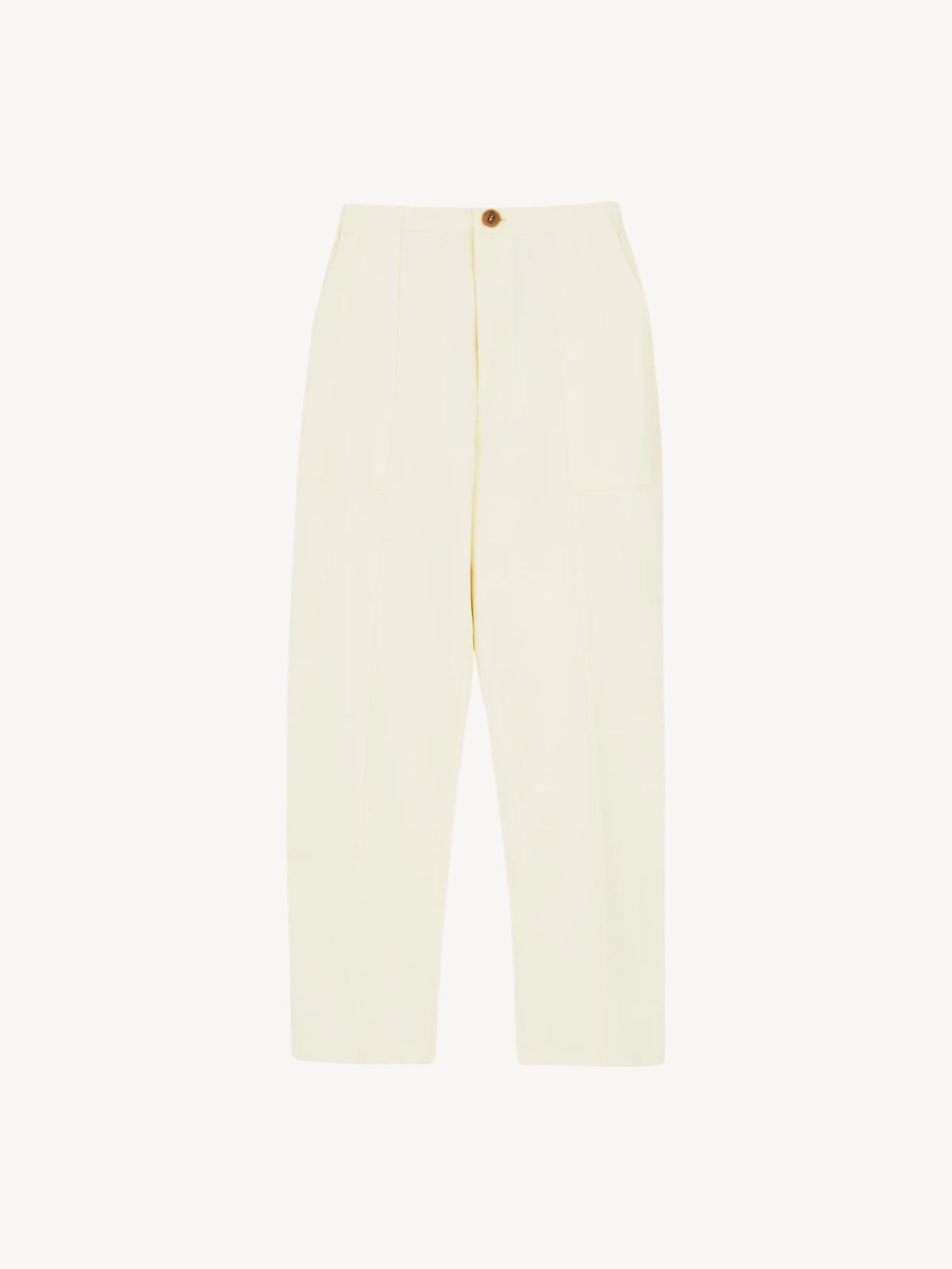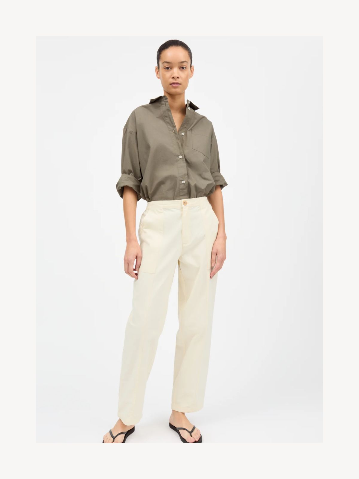 Disse casual bukser i økologisk bomuldstwill har et afslappet og moderne udtryk med fokus på komfort og funktionalitet. Den semihøje talje kombineret med elastisk linning bagpå giver en behagelig og fleksibel pasform, mens de synlige syninger tilfører et råt og stilrent look. Bukserne er designet med funktionelle frontlommer og påsyede baglommer, der fuldender det praktiske design. Fremstillet i GOTS-certificeret bomuld er de et mere ansvarligt valg uden at gå på kompromis med kvaliteten.