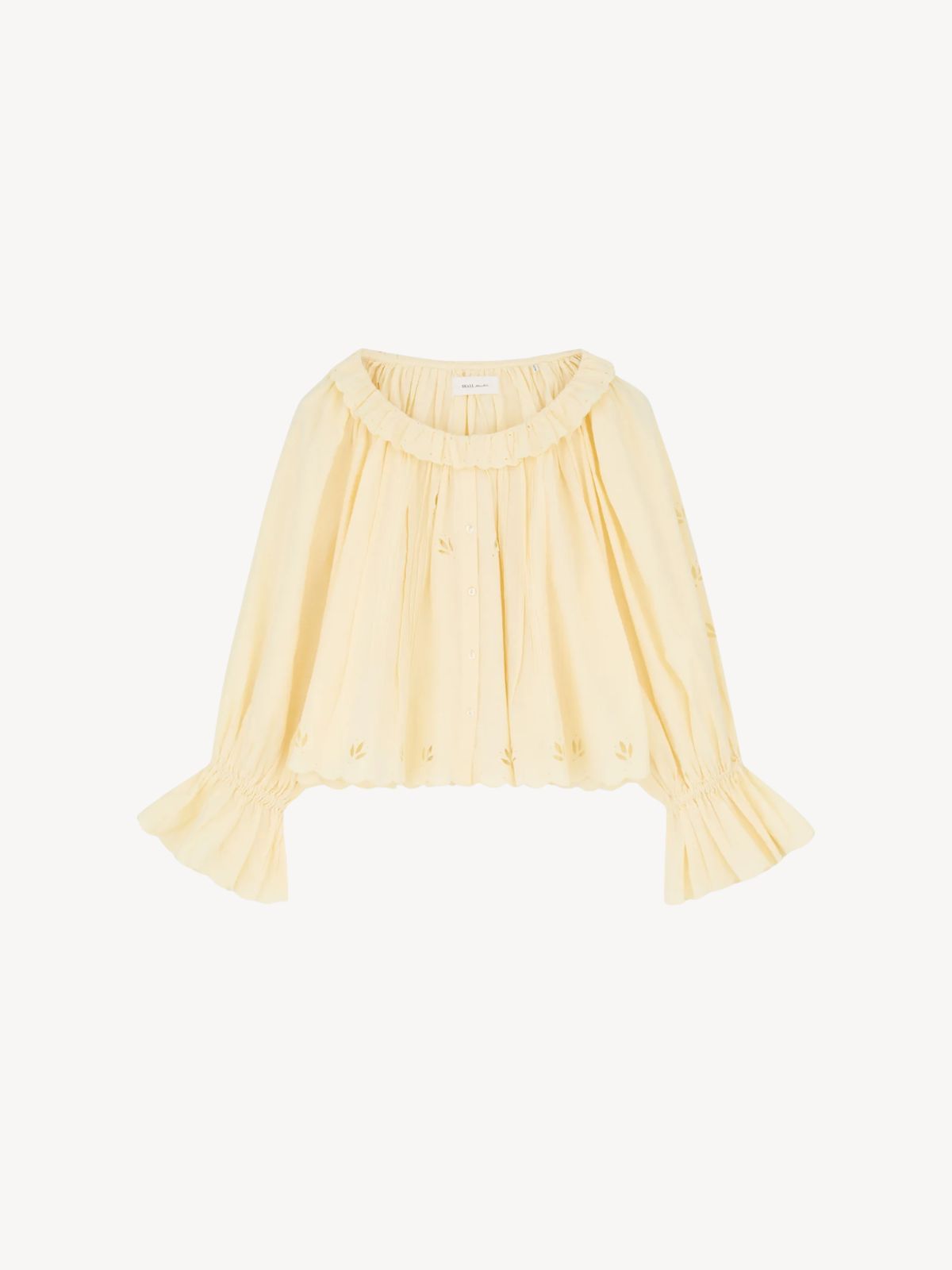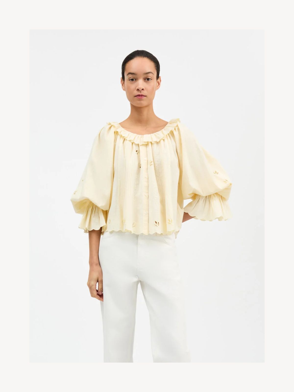 Denne bluse kombinerer et let og feminint udtryk med fine håndværksdetaljer. De bløde raglanærmer giver en afslappet silhuet, mens den åbne, runde halsudskæring med flæsekant tilfører et elegant og romantisk touch. Blusen er gennemknappet og har lange ærmer med elastiske manchetter, som giver en behagelig pasform. De dekorative broderier og udskæringer fremhæver det unikke design og skaber et luftigt og raffineret look.