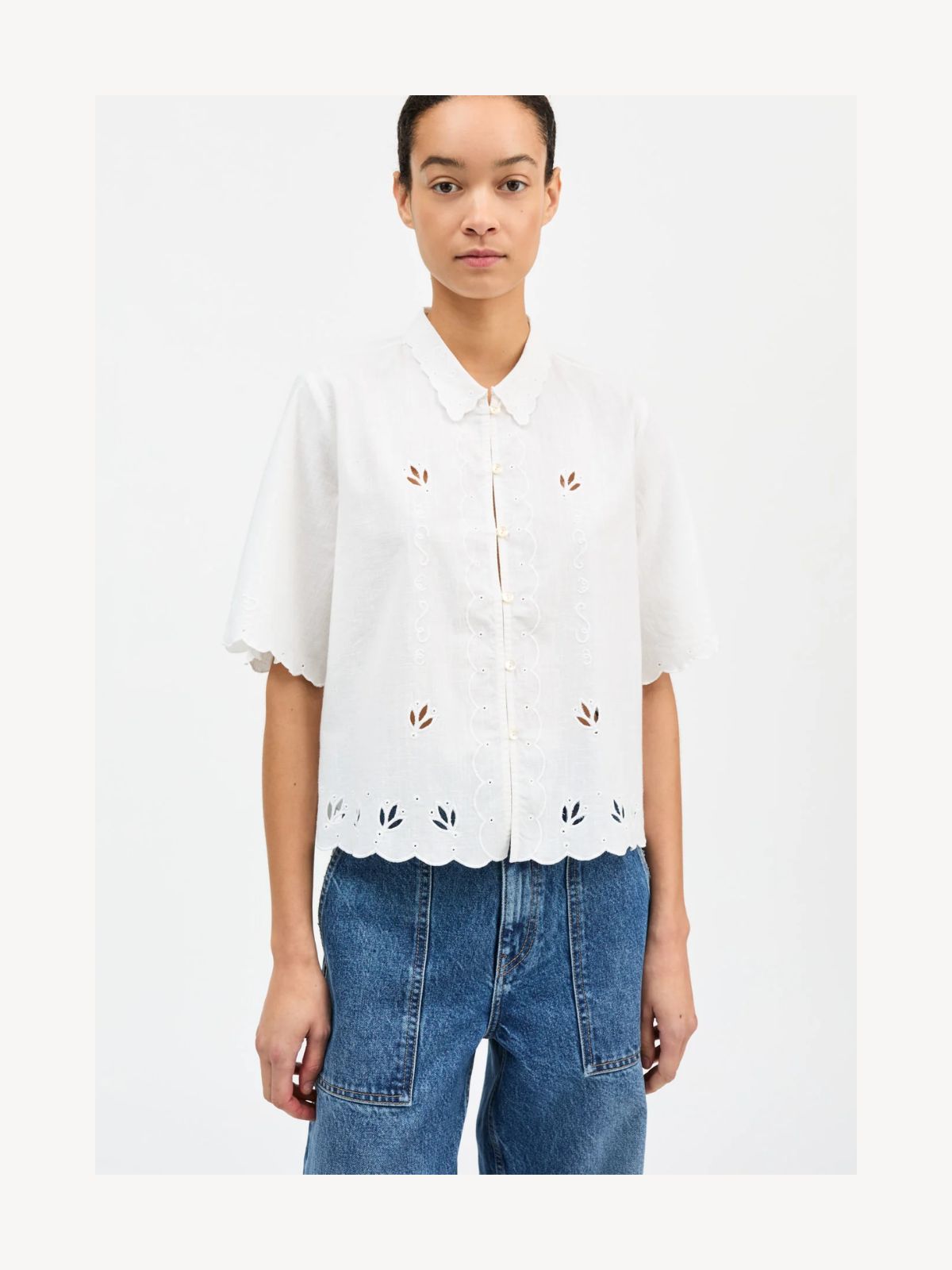 Denne kortærmede skjorte kombinerer klassiske skjortedetaljer med delikate håndværkselementer. Den har en tidløs skjortekrave og gennemgående knaplukning, mens de halvlange ærmer skaber en let og afslappet silhuet. Broderidetaljer og fine udskæringer tilfører et luftigt og dekorativt touch, der gør skjorten både elegant og feminin. Fremstillet i en blanding af økologisk bomuld og hør, er den både behagelig og ansvarlig i sit valg af materialer.