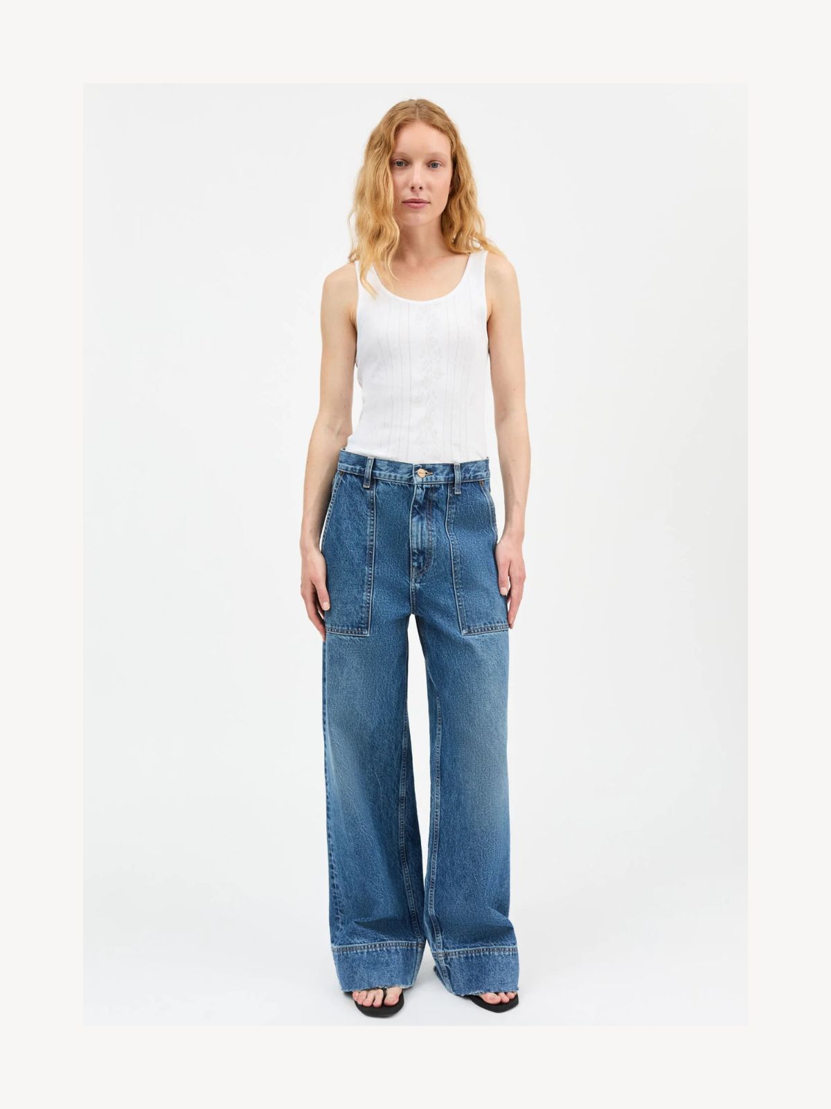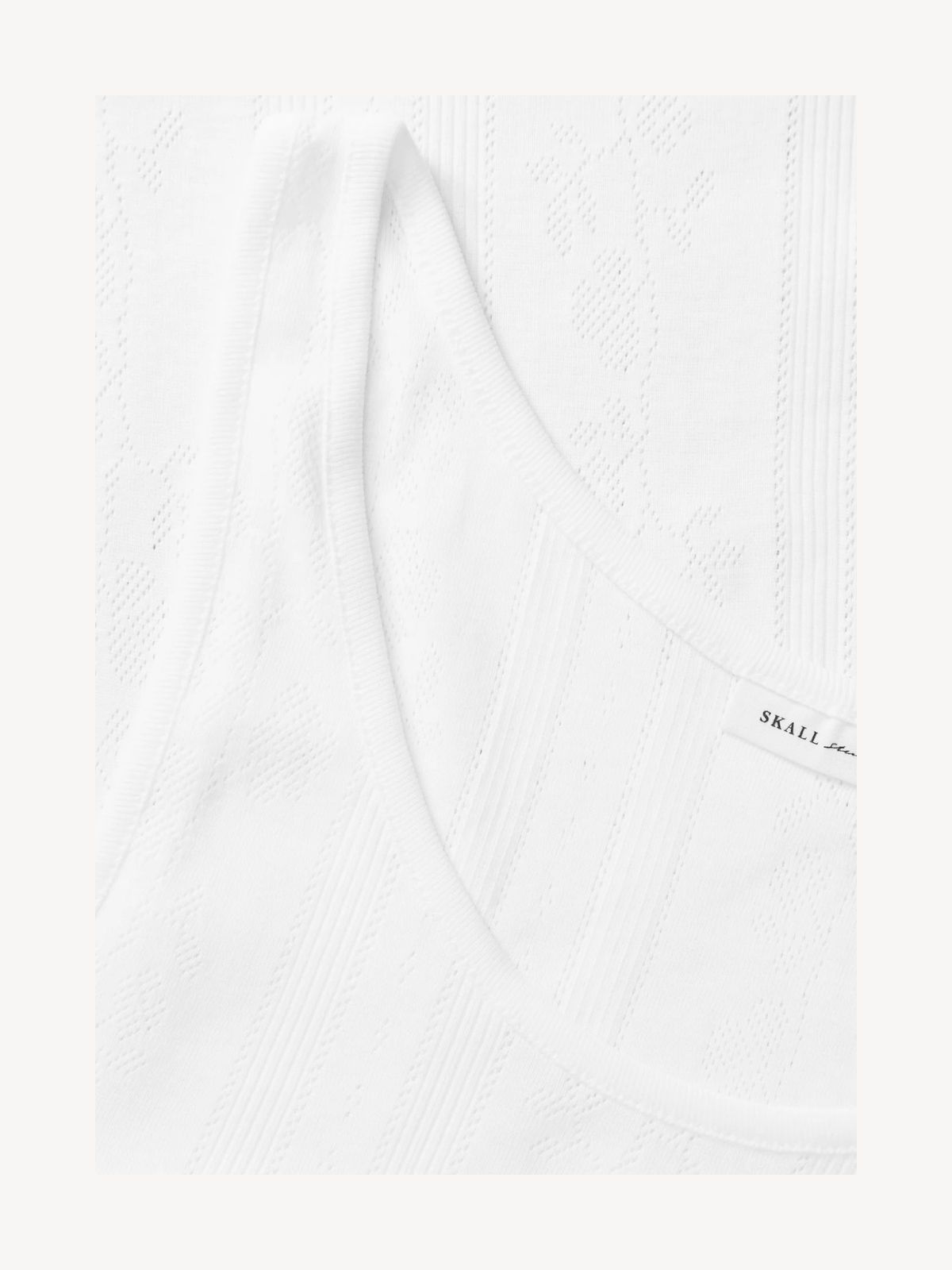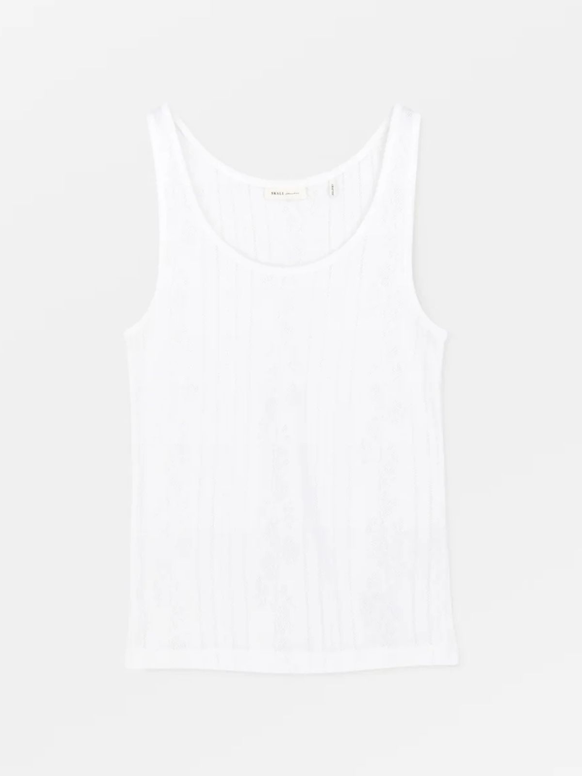 Denne top er fremstillet i blød, økologisk bomuld med et fint blomstret hulmønster, der giver et let og feminint udtryk. Den runde udskæring og ribkanterne fuldender det enkle design, mens pointelle-strukturen tilfører et delikat og eksklusivt touch.
