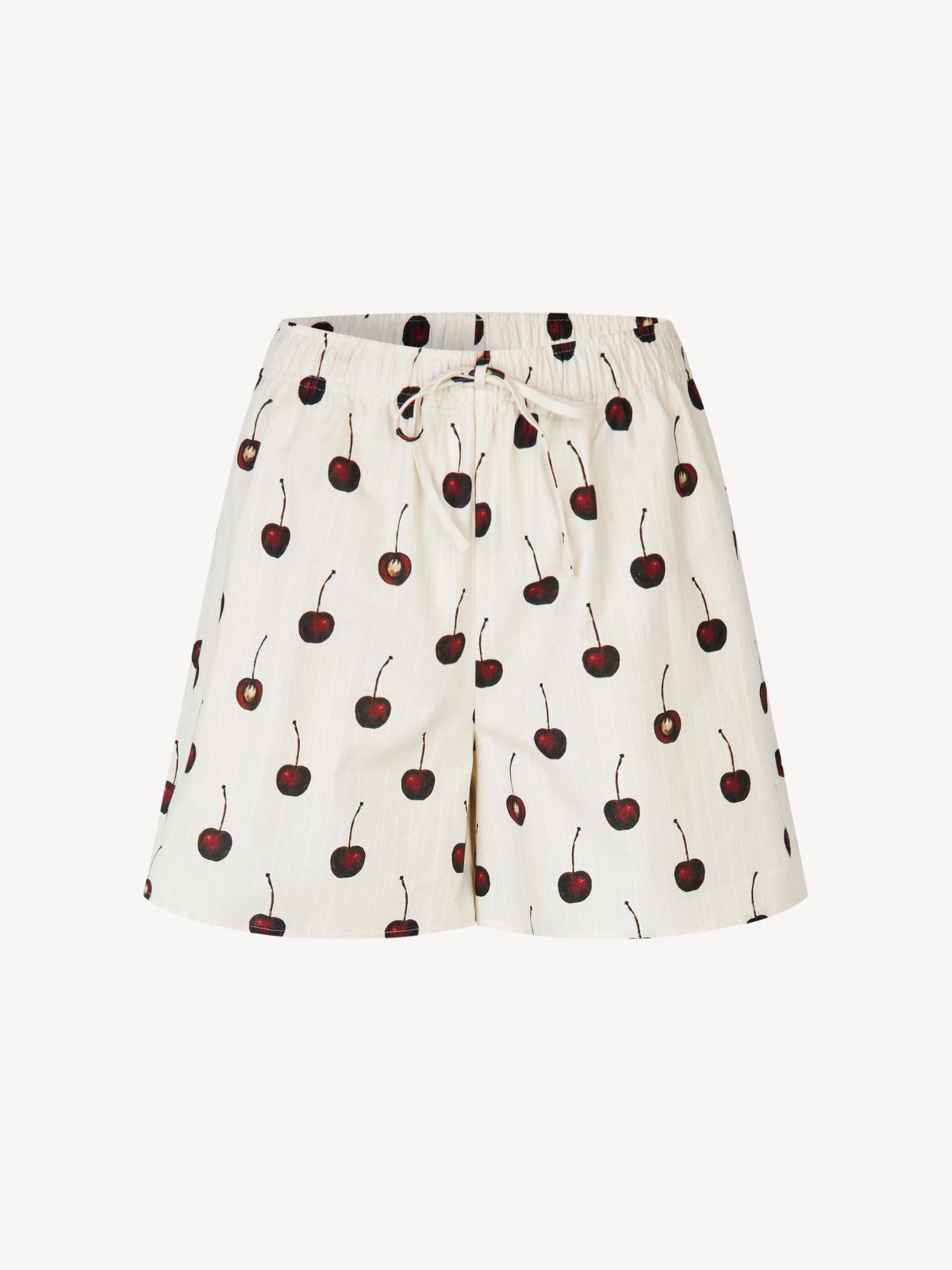 Cremefarvede shorts med et frisk kirsebærprint, designet med en elastisk talje og justerbar snøre for optimal komfort og pasform. Shortsene giver et afslappet og legende udtryk og kan styles perfekt med den matchende skjorte for et samlet, sommerligt sæt.