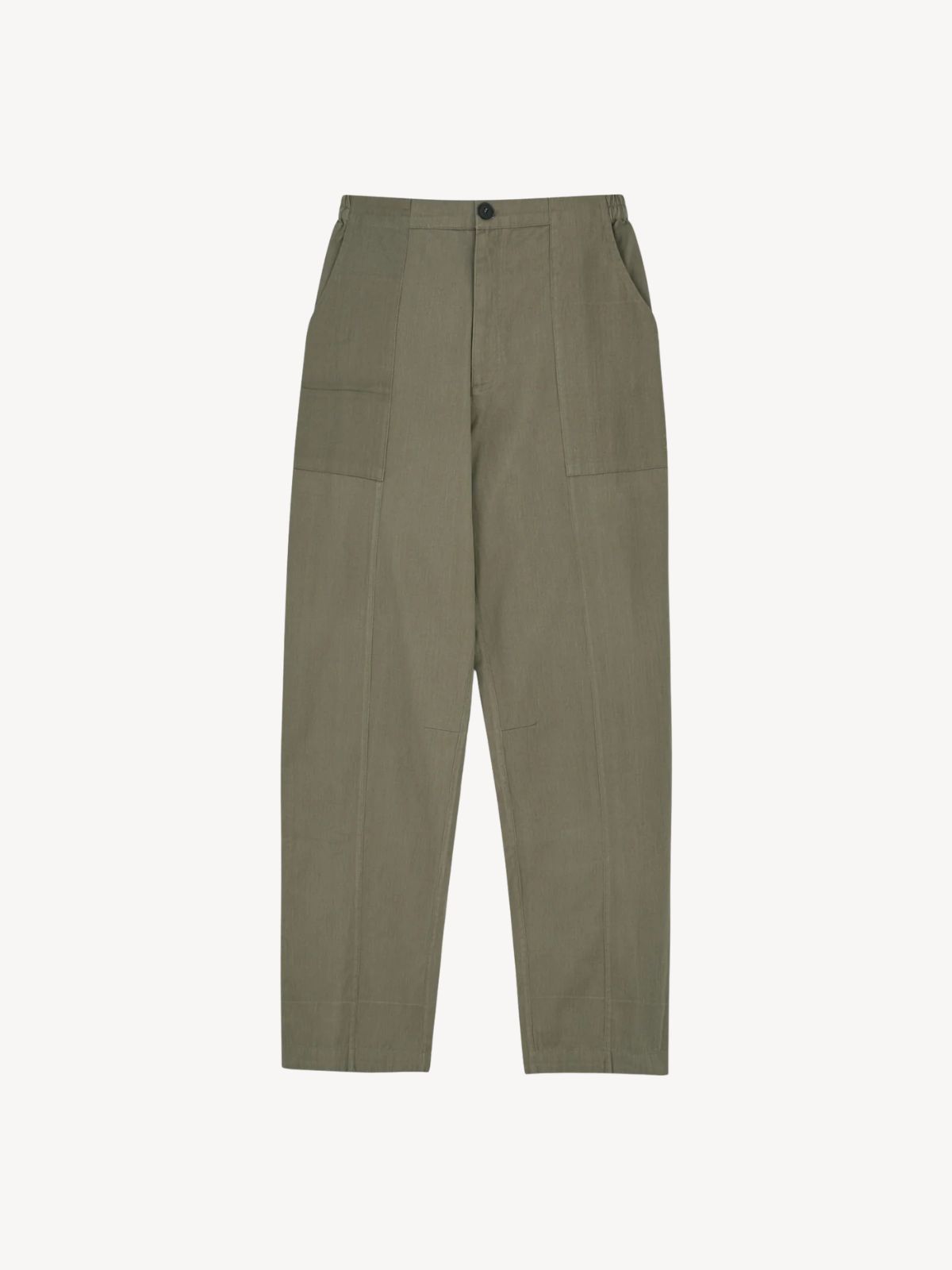 Disse casual bukser i økologisk bomuldstwill har et afslappet og moderne udtryk med fokus på komfort og funktionalitet. Den semihøje talje kombineret med elastisk linning bagpå giver en fleksibel og behagelig pasform, mens de synlige syninger tilfører et råt og stilrent look. Bukserne er designet med funktionelle frontlommer og påsyede baglommer, der fuldender det praktiske og tidløse design. Fremstillet i GOTS-certificeret bomuld er de et mere ansvarligt valg uden at gå på kompromis med kvaliteten.