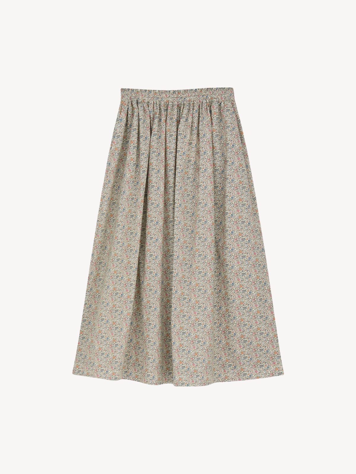 Denne nederdel i økologisk bomuld er fremstillet i smukt Libertystof, som giver et unikt og eksklusivt udtryk. Den elastiske talje sikrer en behagelig og fleksibel pasform, mens den voluminøse silhuet skaber et let og feminint fald. Nederdelen kombinerer komfort med et elegant design, der gør den nem at style til både hverdag og mere særlige anledninger.
