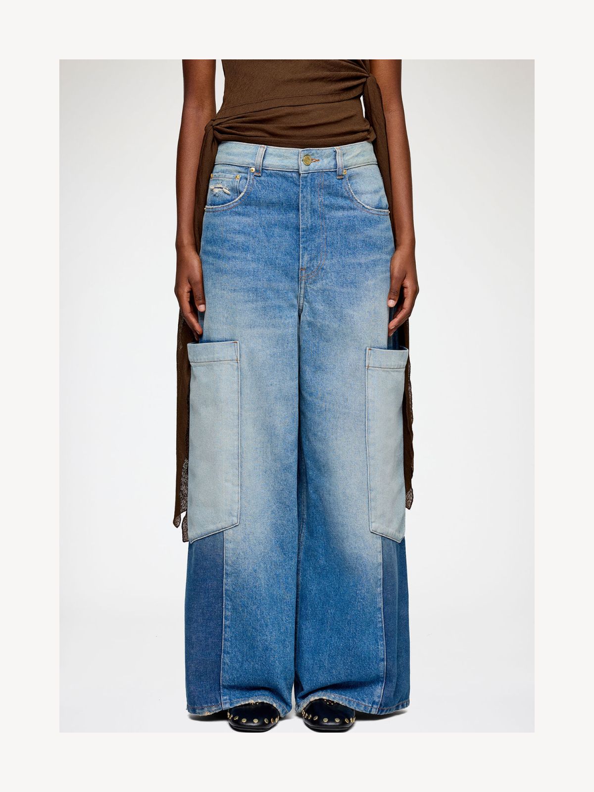 Mellemhøje jeans med lavt skridt og baggy ben i et moderne og afslappet design. Modellen er fremstillet i patchwork denim med karakteristiske påsyede lommer og draperede detaljer, som giver et unikt og råt udtryk. Jeansene er designet til at sidde lavt på taljen og kan styles som unisex. Ønskes en mere markant høj talje, anbefales det at gå en størrelse ned.