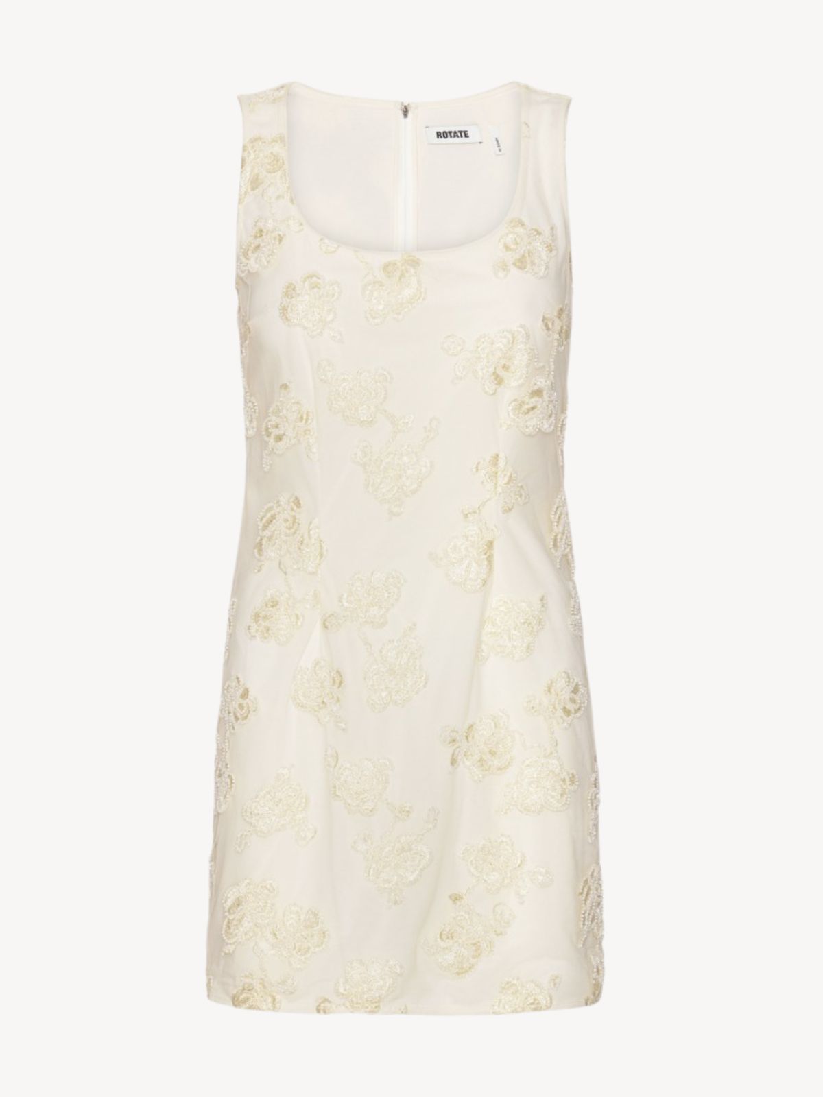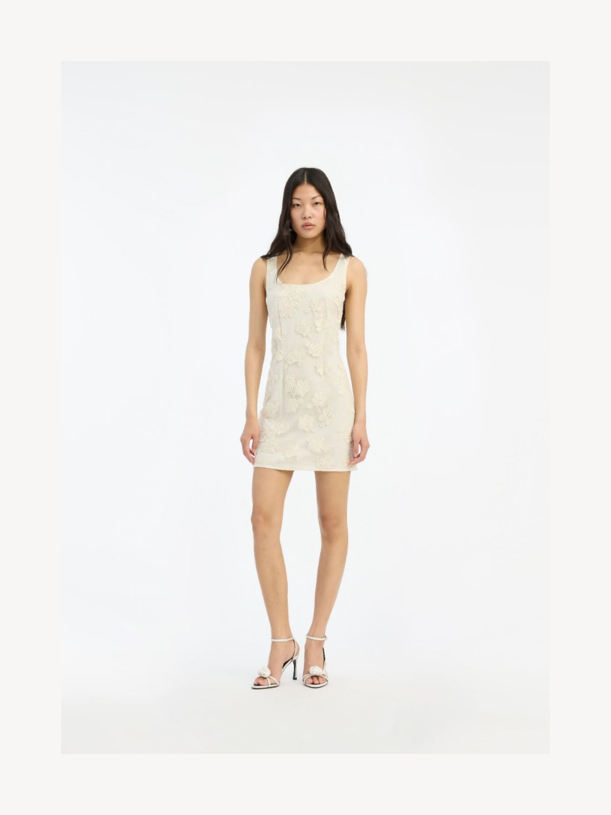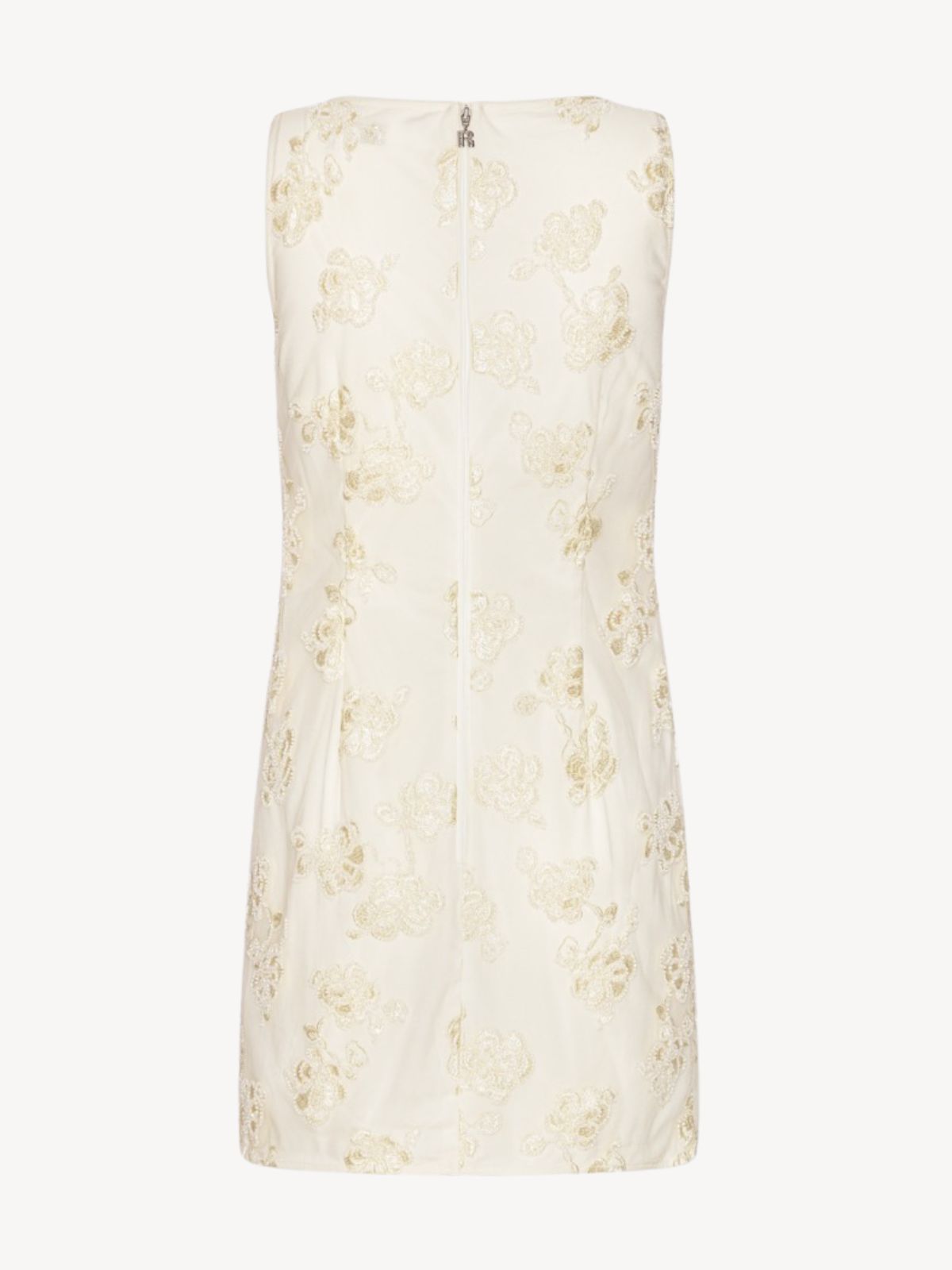 Beaded Mini Dress i farven Egret White er en elegant og feminin minikjole med en tætsiddende silhuet, der fremhæver kroppens former på en sofistikeret måde. Det ærmeløse design og den runde halsudskæring giver et klassisk og stilrent udtryk, mens den korte længde tilfører et moderne touch.