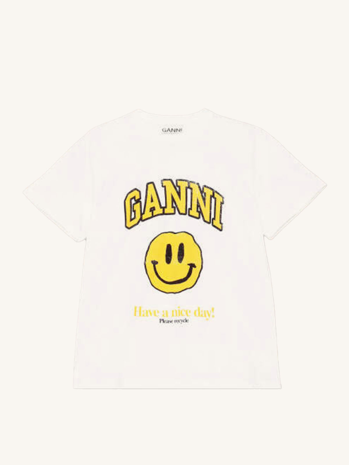 Klassisk T-shirt med GANNI-logo og grafisk print i 100% certificeret økologisk bomuld med vores karakteristiske GANNI-smileymotiv.