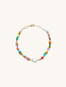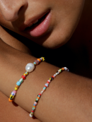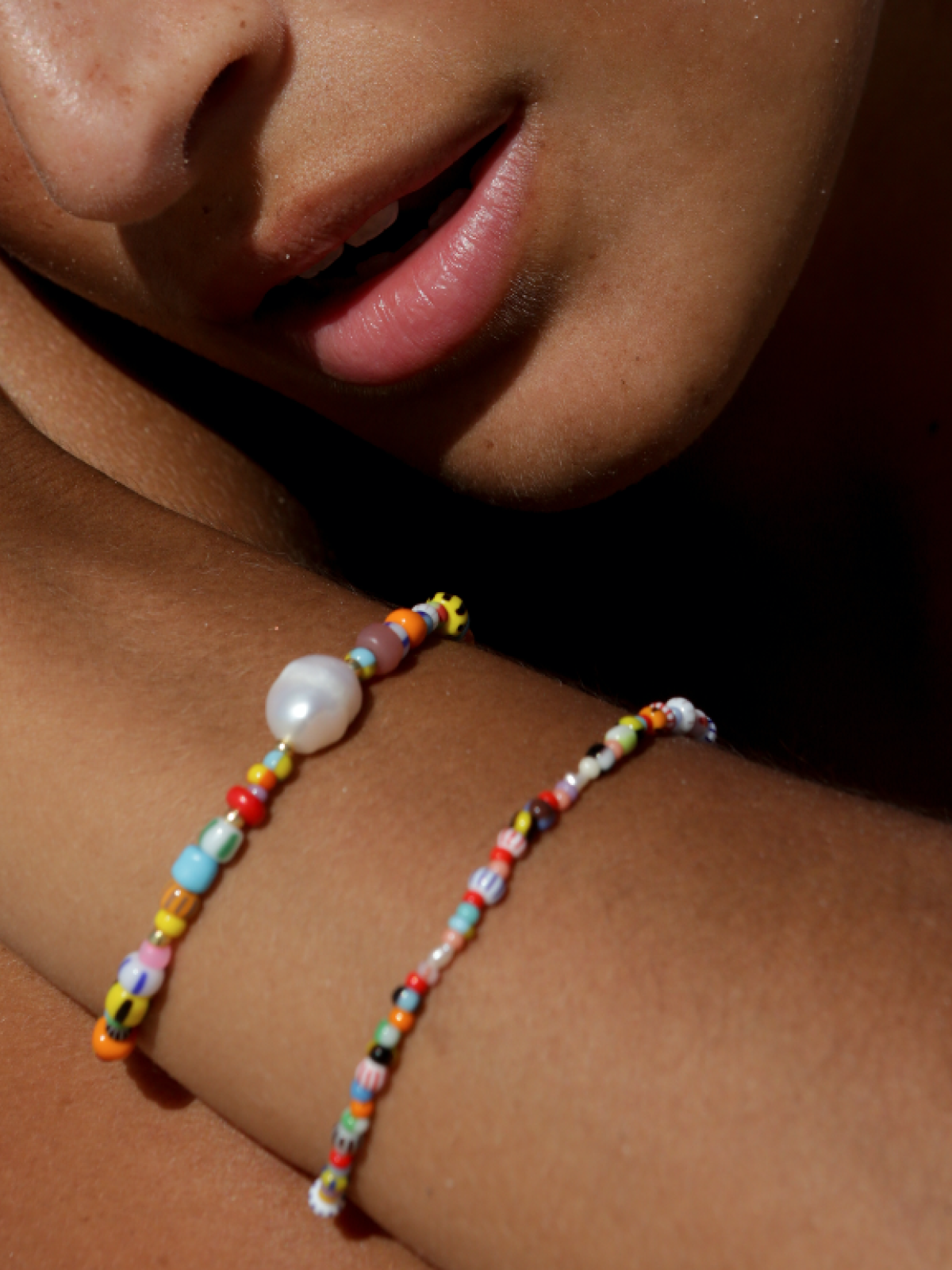 Smukt armbånd med farverige glasperler og en hvid ferskvandsperle.
