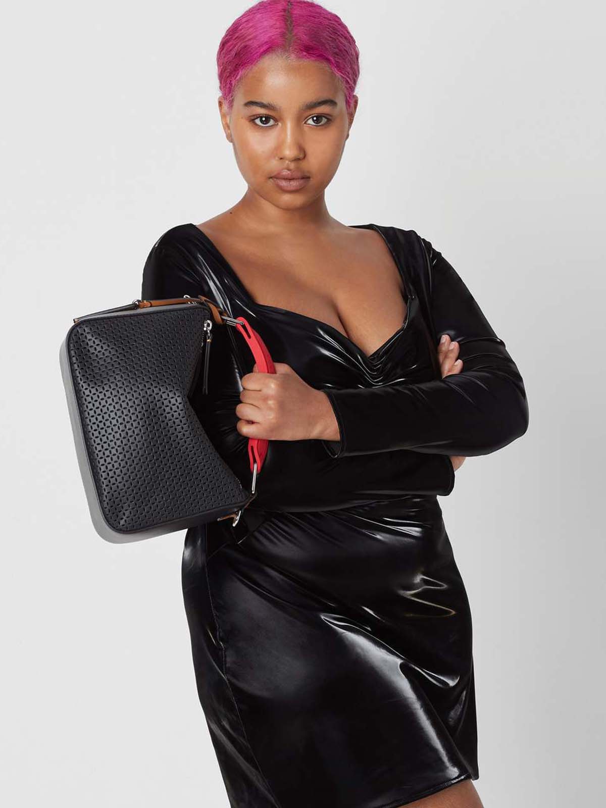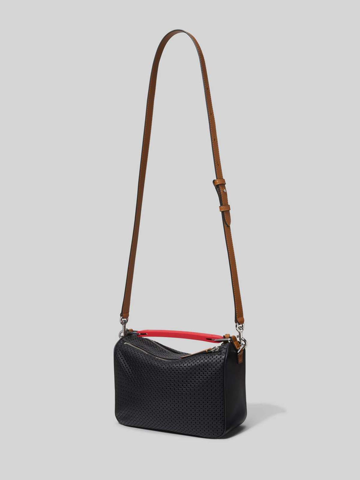 Tasken er i perforeret læder og med aftagelig crossbody-rem.