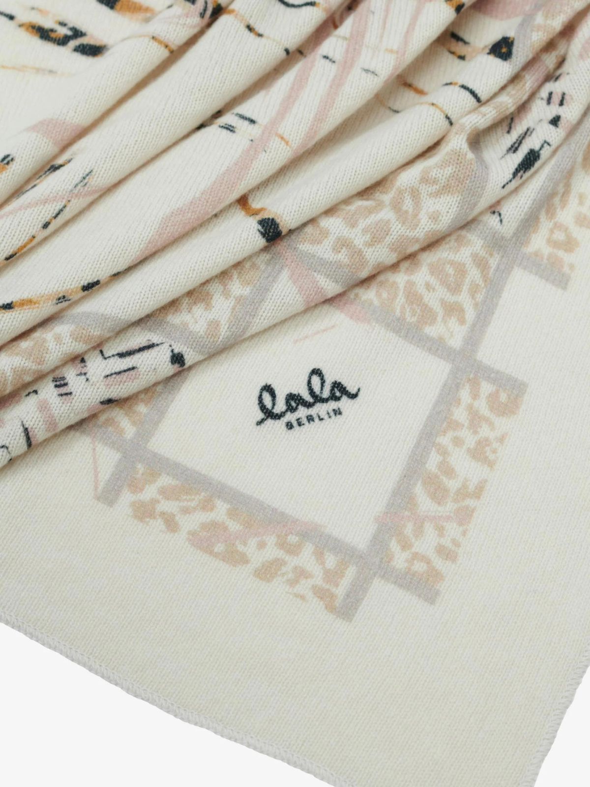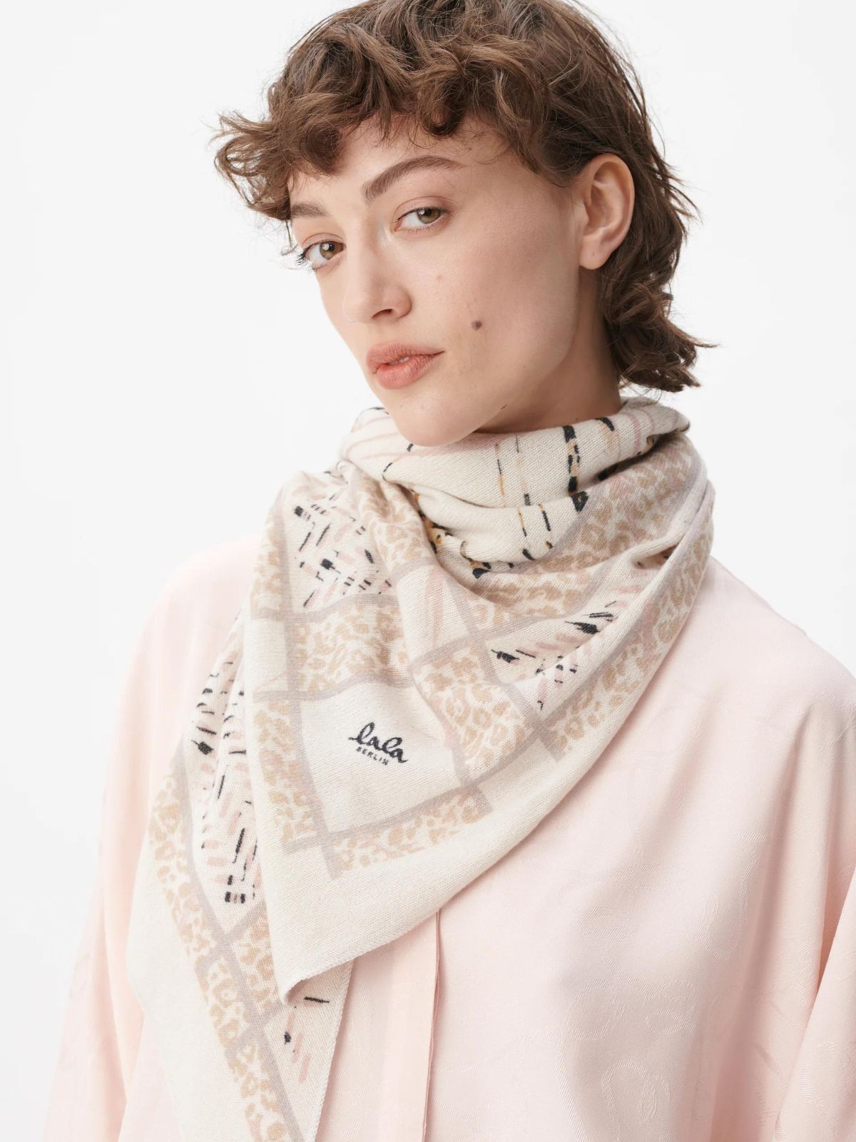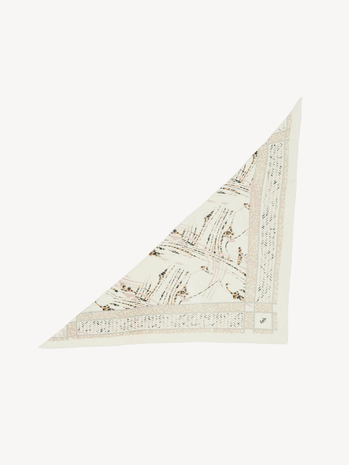 Smuk tørklæde designet med et livlige prints på en blød råhvid baggrund.
