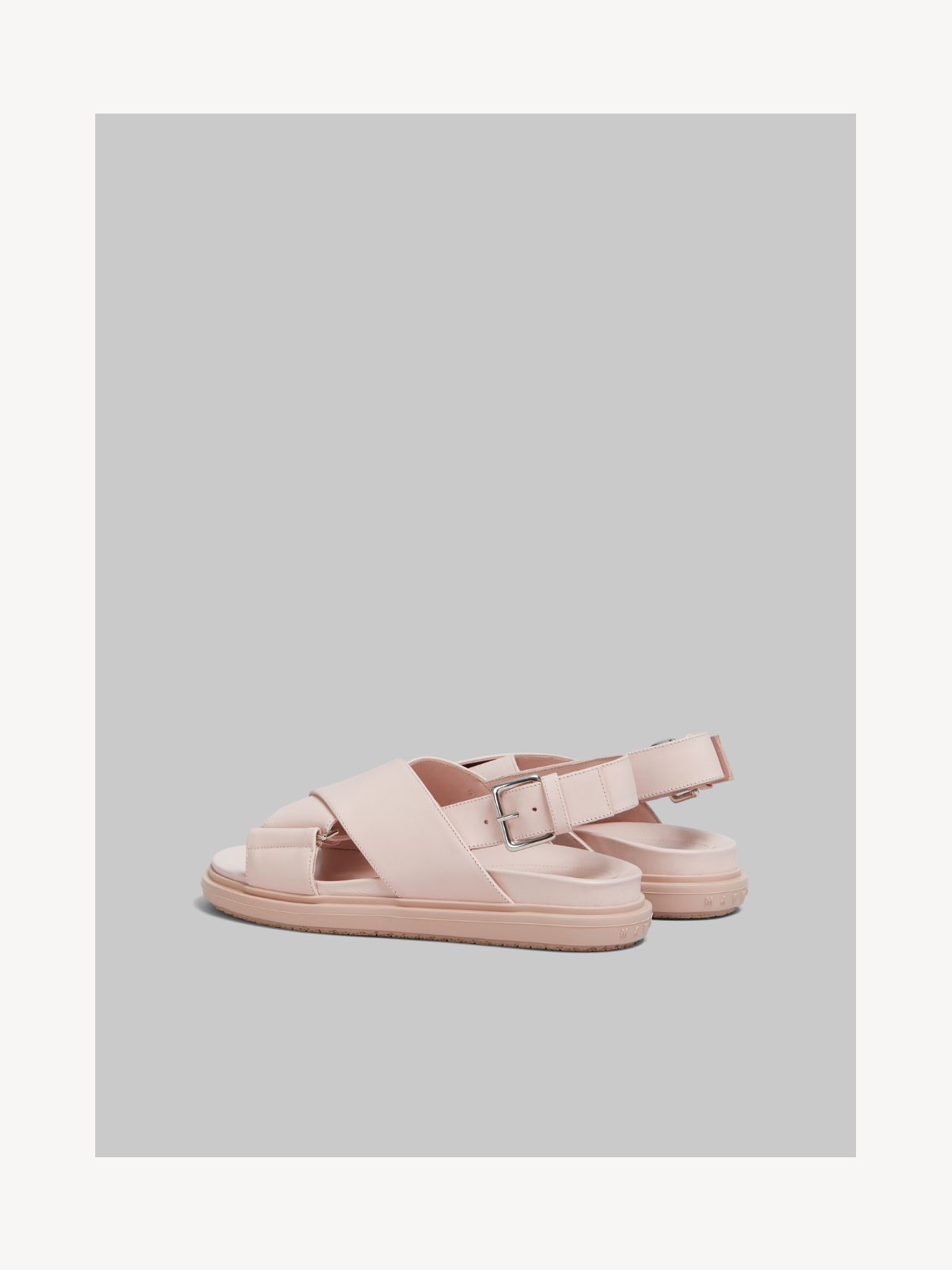 Den ikoniske Fussbett-sandal er udført i glat kalveskind med krydsede remme og justerbar spænderem. Sandalen har et ensfarvet design med en læderindersål i matchende tone og en gummisål. Hælen er dekoreret med Marni-logo i relief.