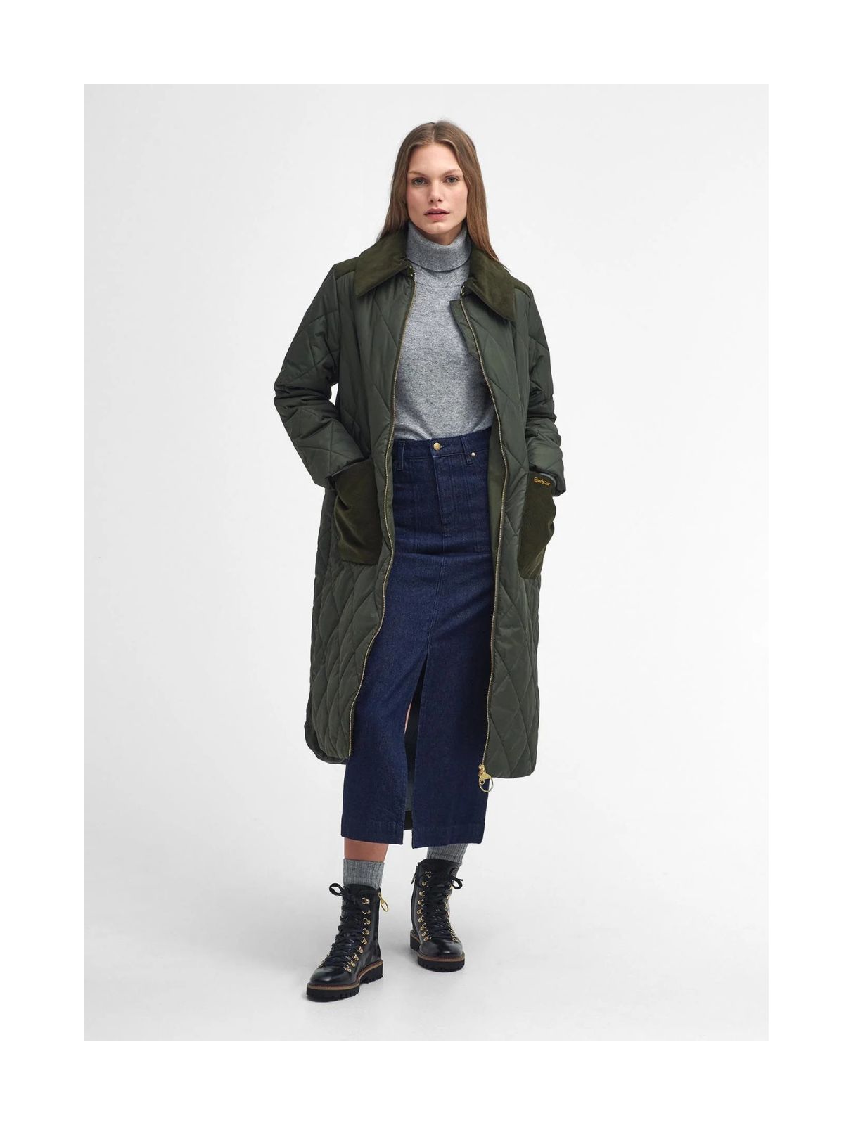 Denne sæson hylder Barbour det karakteristiske diamantquilt, som mærket er kendt for. Barbour Malton Quilted Jacket fremhæver dette let genkendelige detalje med sin oversized silhuet. Jakken er udstyret med en stor version af det ikoniske kordfarvede krave, en brændemærket ring-pull lynlås og påsatte lommer, hvilket gør den ideel til stilfuld udendørs brug.