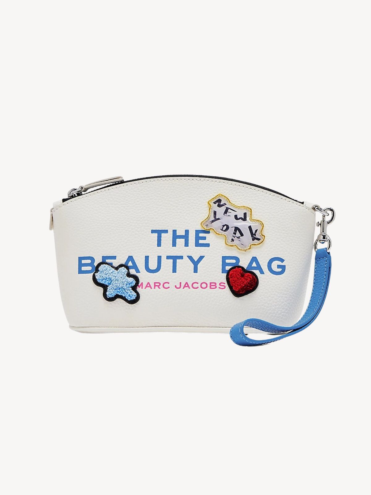 Smuk og cool beauty taske fra Marc Jacobs. Tasken har klistermærker lignende patches på, og en lynlås. Den er rummelig, og perfekt til sæsonen.